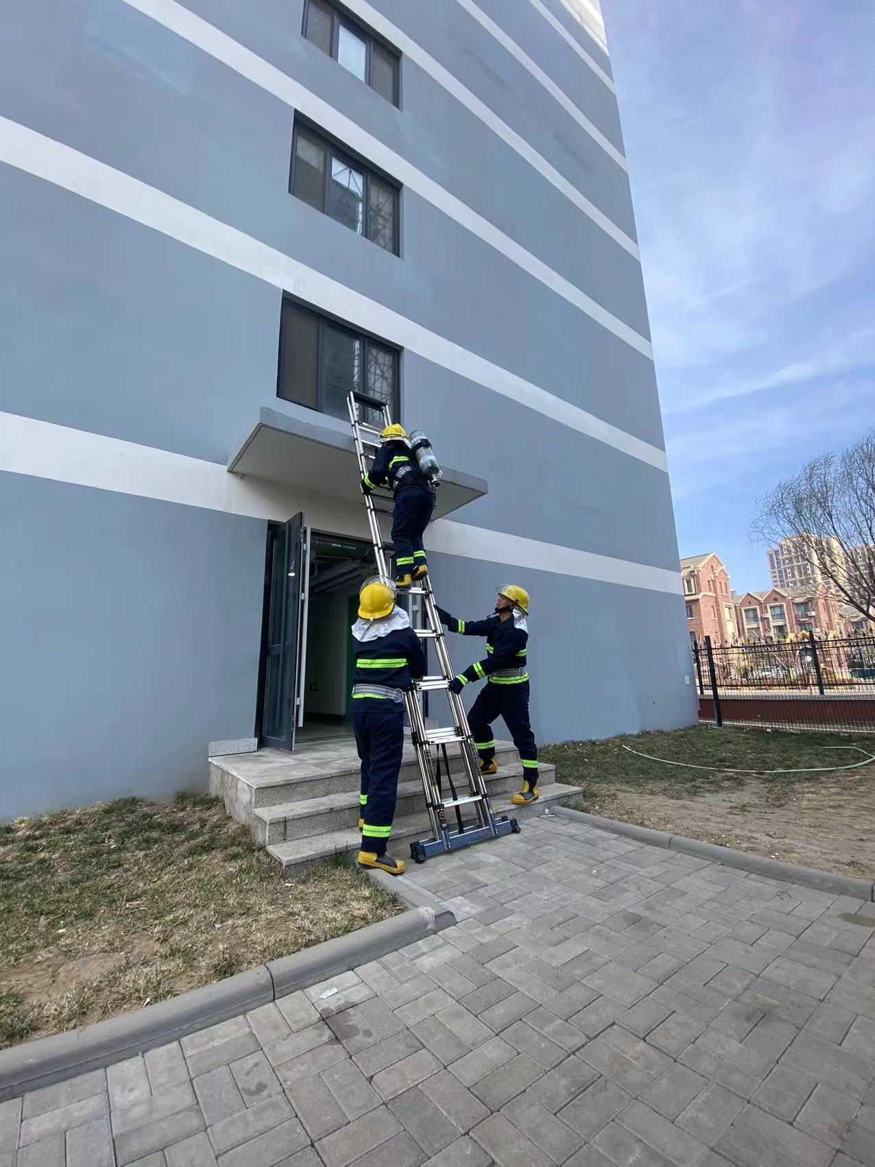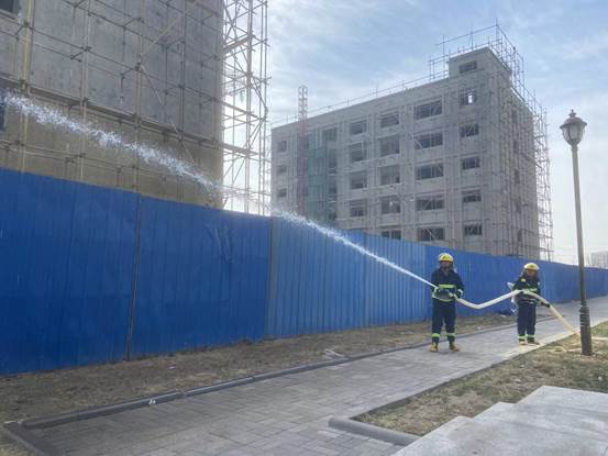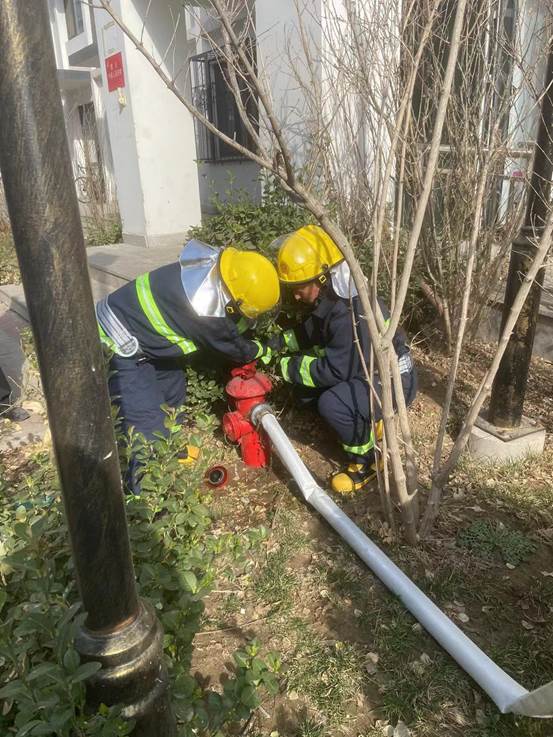 3、一分钟内,第一批微型消防站人员手提灭火器到达现场。三分钟内,第二批微型消防站人员手提灭火器具赶到现场,立即连接室内消火栓水带,向起火房间内喷射灭火,进行救援灭火工作;