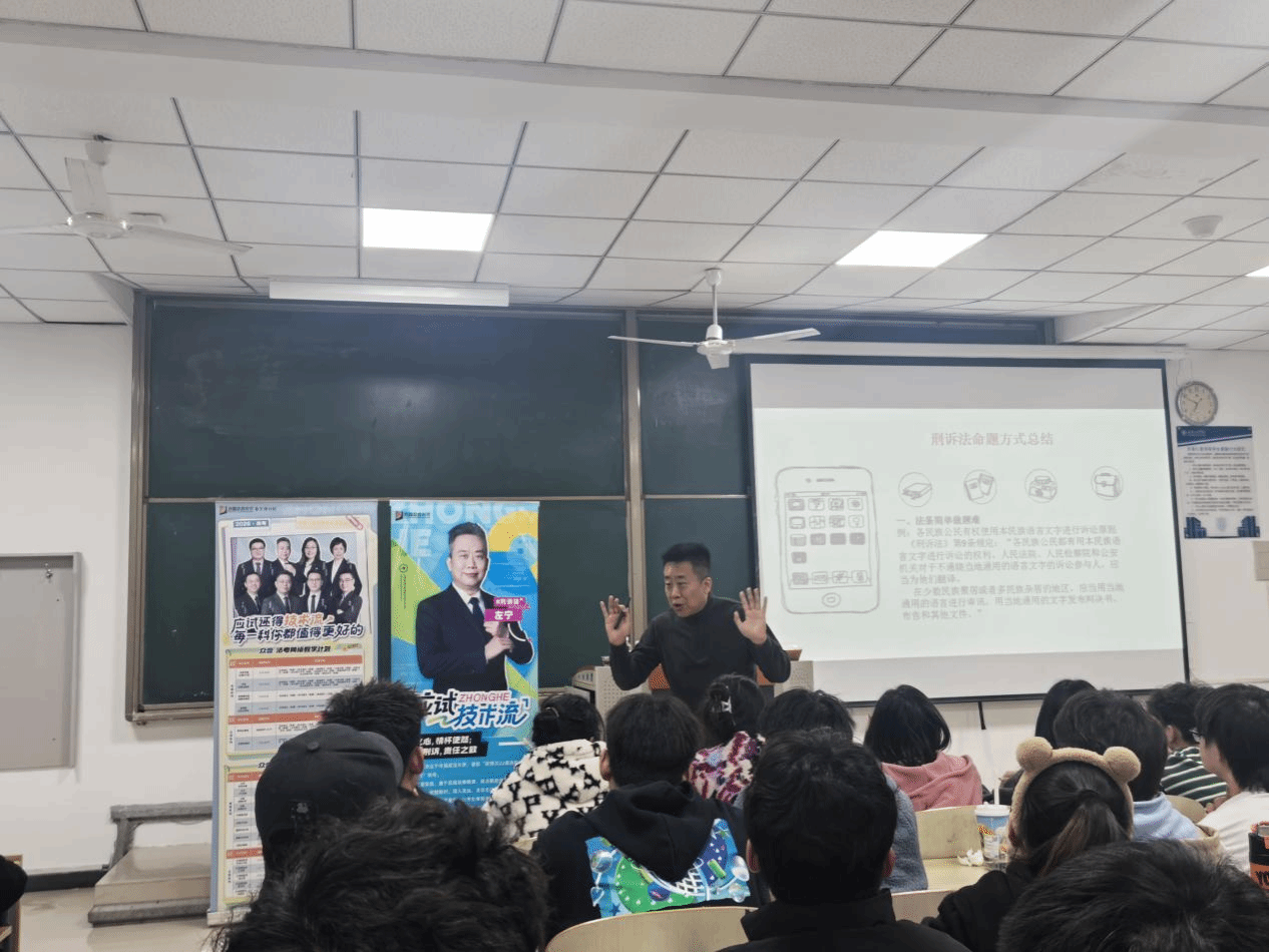 左宁老师还就法考的总体内容结构、命题特点与发展趋势进行了详尽解读,并为同学们提供了极具针对性的备考策略。他勉励大家,面对法考,重在构建体系化的知识框架与培养灵活的法律思维能力,切忌陷入死记硬背的窠臼。其间,他穿插分享的个人学习与执业经历,以及不时迸发的幽默智慧,使得整场讲座既有知识的深度,又不乏轻松愉快的氛围,极大地激发了同学们的学习兴趣。