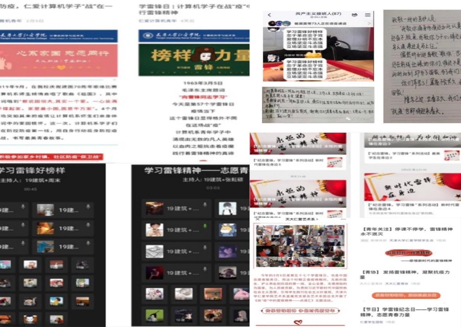 学院在抗疫期间共计开展志愿服务累计时长 15499 小时。志愿活动中各系周密部署,统一安排,结合“学习雷 锋精神——志愿青春·与国同行”主题教育实践活动,制定实践活动方案,发挥网络育人优势,积极开展线上学雷锋主题教育活动,将学雷锋志愿服务活动制度化、常态化。这些活动中涌现的事迹,充分展现了仁爱学生浓浓的家国情怀和时刻将小我融入大我的精神风貌。仁爱学院全体共青团员登陆“志愿中国(志愿汇)APP”,10119 名学生注册成为中国青年志愿者。各系、群团组织积极开展“思想引领,话雷锋,学雷锋”主题教育活动,通过云班会、在线知识问答等多种载体,利用超级校园 app、微信公众号等平台,以“学习雷锋,纪念雷锋”为主题,向师生积极宣传雷锋精神及学生实践事例,培养学生用志愿服务精神点 亮奋斗青春,与祖国同行的坚定信心。