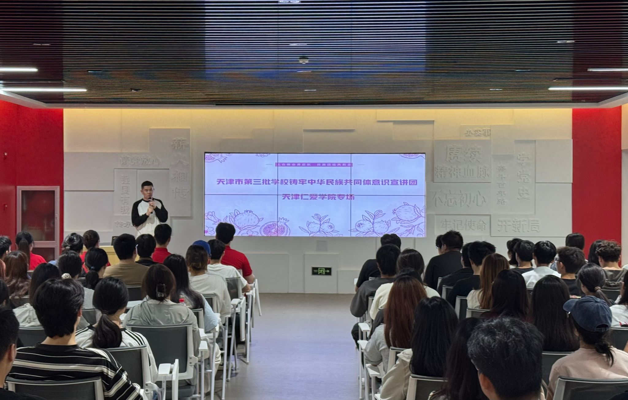 为深入推进铸牢中华民族共同体意识教育走深走实,进一步拓展其影响力与覆盖面,促进各民族学生交往交流交融、共同成长进步,9月25日,我校学生工作部特邀请天津市第三批铸牢中华民族共同体意识宣讲团进校开展专题宣讲活动。此次宣讲由天津市少数民族学生管理服务工作室迪力夏提・艾合买提老师主持,来自天津中医药大学、天津师范大学、天津职业技术师范大学等院校的5名宣讲团成员,结合自身成长经历与实践感悟依次登台分享、开展宣讲。各学院学生代表现场参与活动,共同聆听学习。