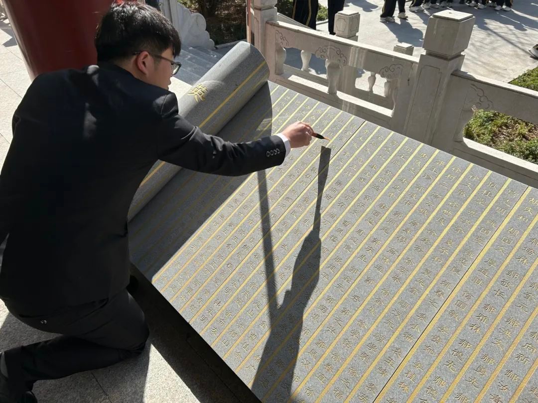 随后,学生党员手持朱漆金粉,俯身于烈士墓碑前,沿着“革命烈士永垂不朽”的刻痕细细描摹,这个过程,是同学们贴近烈士、学习烈士事迹、接受精神洗礼的重要时刻,同时,也将革命先烈的伟大精神深深镌刻在心中。