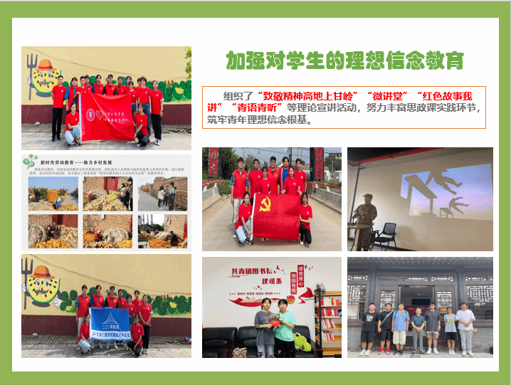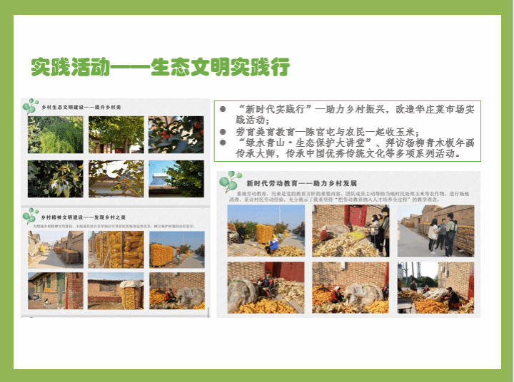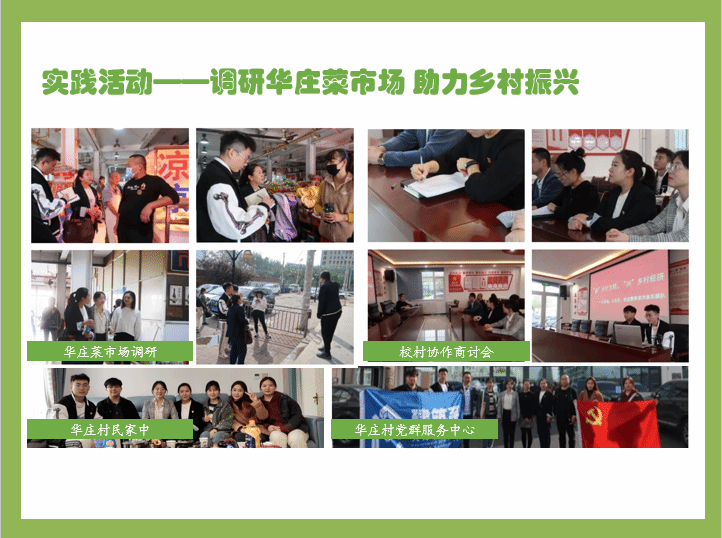 “新时代实践行”——助力乡村振兴,改造华庄菜市场实践活动;劳育美育教育—陈官屯与农民一起收玉米;“绿水青山·生态保护大讲堂”、传承中国优秀传统文化等多项系列活动。