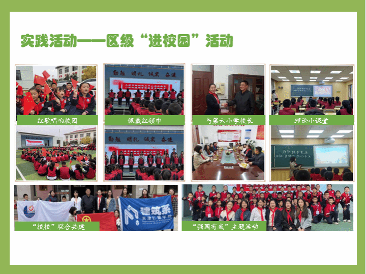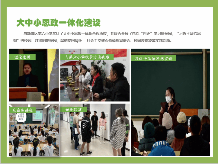 与静海区第六小学签订了大中小思政一体化合作协议,并联合开展了包括“习近平法治思想”进校园、红歌唱响校园、社会主义核心价值观宣讲会、校园反霸凌等实践活动。