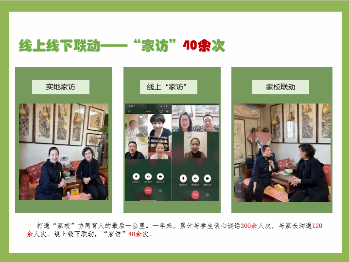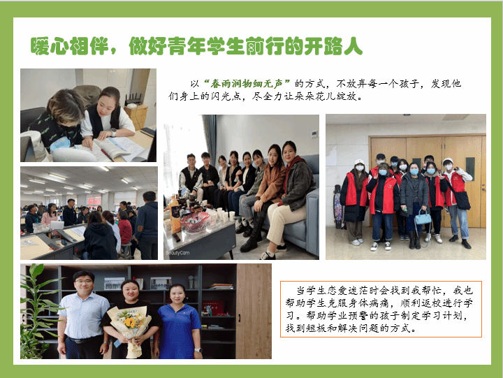暖心相伴,做青年学生前行的开路人。冰冷毫无感情的人是做不了高质量的辅导员的,心里始终有学生,为学生解决实际困难,深受学生爱戴。开设了“忘忧杂货铺”,帮助多名心理问题学生走出了心理阴霾。自担任辅导员工作,所带学生安全稳定,没有出现任何状况。建立了家校联动机制,通过线上家长会 “家访”等多种途径深度开展家校联动,打通“家校”协同育人的最后一公里。日常工作中用心用情用力付出,想学生之所想,急学生之所急,点对点帮扶毕业班学生就业,以三全育人理念加强辅导员与专业课教师协同育人路径,疫情阻击战中,当好数据统计员和学生的心理疏导员,是学生心目中无话不谈的“楠楠姐”。学生有好消息时她们总是第一时间同她分享,有困难时他们会第一个找她倾诉。作为辅导员,收获了满满的源自学生的幸福感。