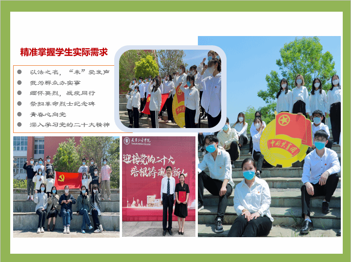 善做青年友,做青年思想工作,首先是要了解青年,走进青年,她善于用青年喜闻乐见的形式做好青年思政工作。在过去的一年里组织开展了“以法之名,未爱发声”、“我为群众办实事”、“缅怀英烈,战疫同行”“青春心向党”“深入学习党的二十大精神”等系列活动,着力于对青年的理想信念教育。此外,通过开展“师说心语”下午茶、“849我们来帮你”微心愿等活动,精准掌握学生的实际需求。