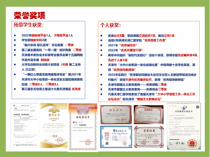 两年中共组织“新时代实践行”活动10余项,获评天津市先进集体奖4项,先进个人奖1项,天津市“大中小幼思政一体化绘画比赛”中指导数十名学生获奖,获评“优秀指导教师奖”;2022年参与指导的实践行“京津冀协同建设大运河文化带人文新纽带促进沿线乡村振兴”获评“新时代·生态文明实践行”先进集体标兵,获评“优秀指导教师奖”。