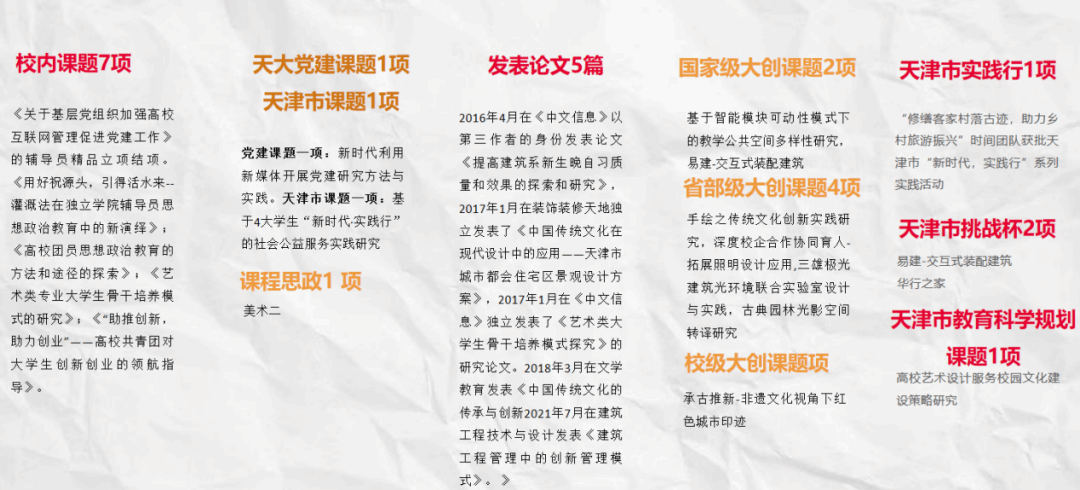 臻于至善,修己度人。育人先育己,她在陪伴学生成长过程中,重视辅导员的业务水平的提升,她说唯有终身学习,不断探索,才能更好地成为学生成长成才的人生导师和健康生活的知心朋友。她和学生一起共同进步。截至目前,在课题方面,她已完成校内课题7项:党建课题一项:天津市课题一项:,围绕学生工作发表文章5篇:国家级大创课题2项:;省部级大创课题4项:;校级大创课题1项:教改一项:课程思政1项,天津市实践行1项,天津市挑战杯2项,天津市教育科学规划课题1项。