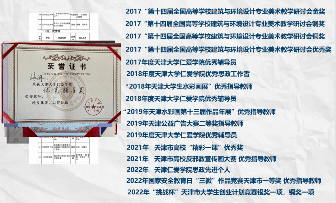 风雨兼程,凯歌高奏。一路风雨兼程,一路凯歌高奏,10项天津市竞赛优秀指导教师,连续三年被评为校级优秀辅导员,天津市“精彩一课”优秀奖,2年被评为校级思政先进个人,2022年被评为校十佳辅导员、校优秀辅导员、校优秀员工。