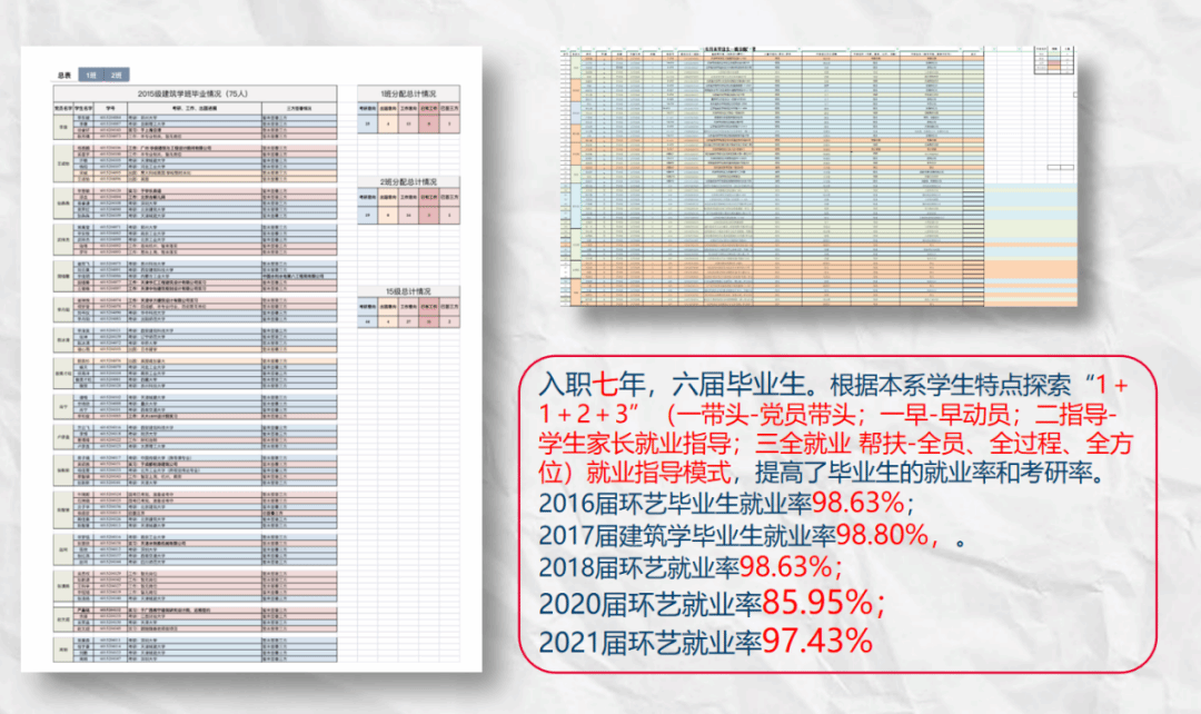 榜样形成力量,让就业工作“活”起来。七年六届毕业生。她根据本系学生特点探索毕业生“1+1+2+3”就业指导模式,提高了毕业生的就业率和考研率。