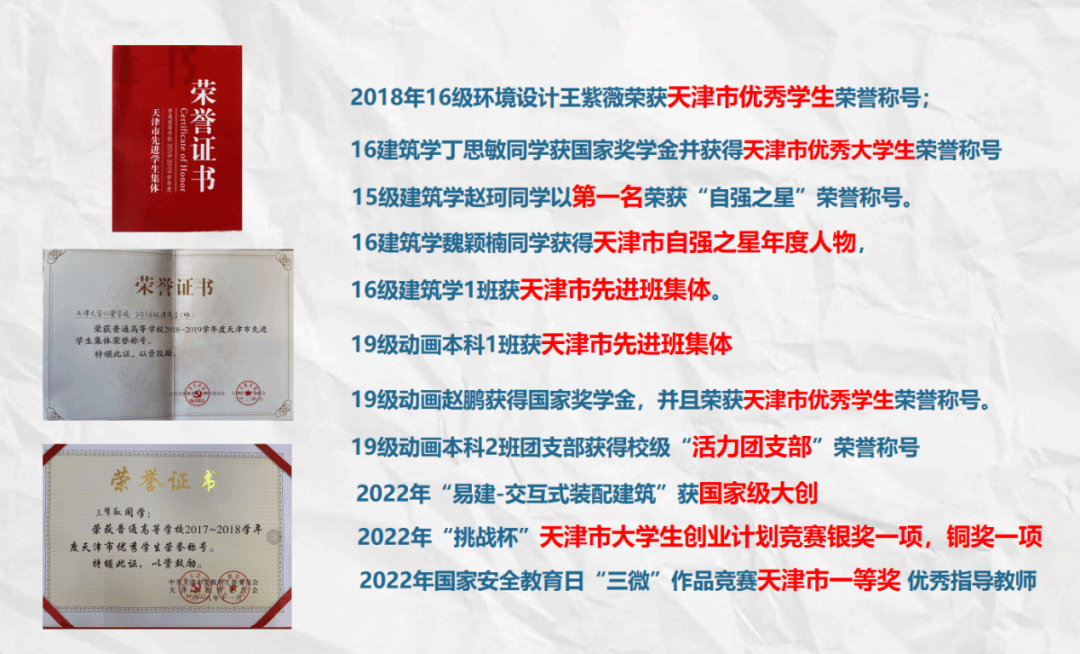 工作上的付出获得了学生的收获,其中7名同学先后获得国家奖学金,3名同学获得人民政府奖学金,2名同学被评为天津市大学生自强自立之星年度人物赵珂, 3名同学被评为天津市优秀学生, 16级建筑学1班、19动画本科1班被评为市级先进班集体,组织学生开展以“奔跑吧,建筑系”为主题的创最佳党日活动被评为天津市教育工委 “创最佳党日”优秀活动,她说,所有努力为了更好的服务学生。
