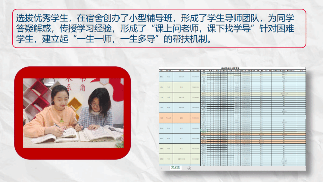 踔厉奋发,笃行致远。精准开展帮扶,让学风建设“强”起来。她说,学生工作没有最好,只有更好。为了落实高教四十条要求,帮助学生聚焦学习主责主业,营造浓厚学风,她依据学生出勤情况、挂科课程、学习能力、思想情况等多维度因素,开展精准帮扶。选拔优秀学生,在宿舍创办了小型辅导班,形成了“课上问老师,课下找学导”针对困难学生,建立起“一生一师,一生多导”的帮扶机制。
