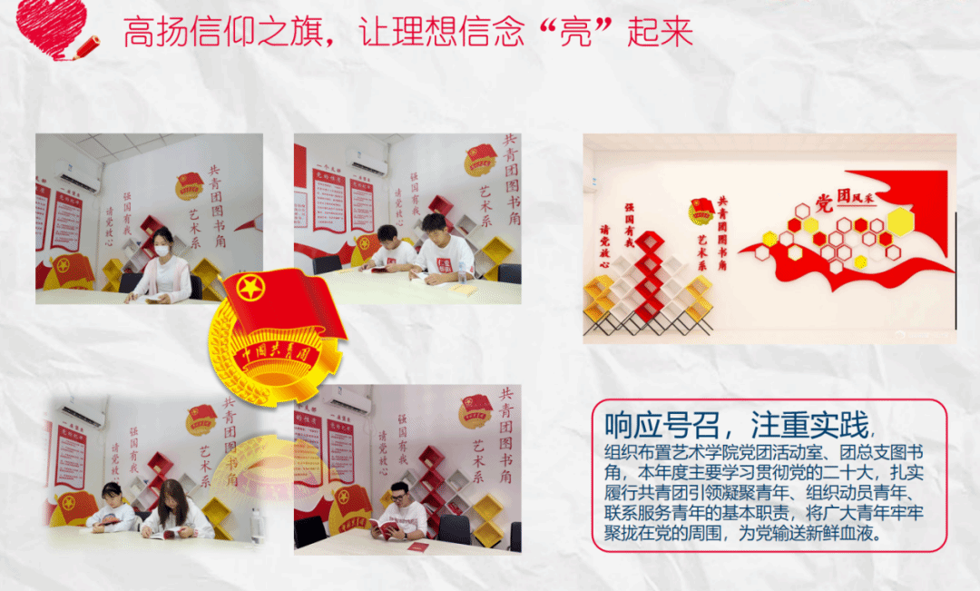 响应号召,注重实践。她组织布置艺术学院党团活动室、团总支图书角,将广大青年牢牢聚拢在党的周围,为党输送新鲜血液。