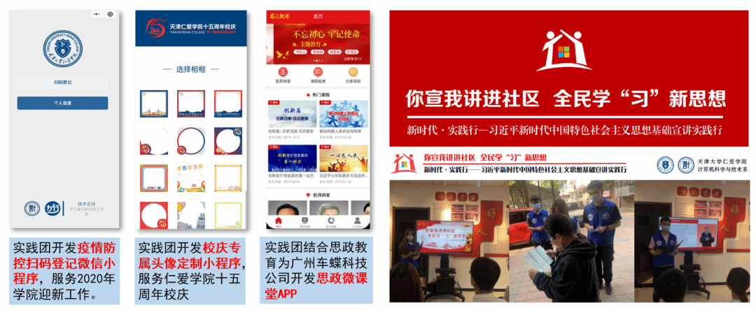 指导学生结合专业特点开发“校园疫情防控小程序”、“思政微课堂”等,强化成果转化,服务校园、服务社会,组织在校外开展宣讲活动,育人成果显著,近年来团队获天津市“新时代·实践行” 先进集体,团队成员获天津市优秀学生、天津市优秀学生干部、天津市优秀团员等荣誉称号。