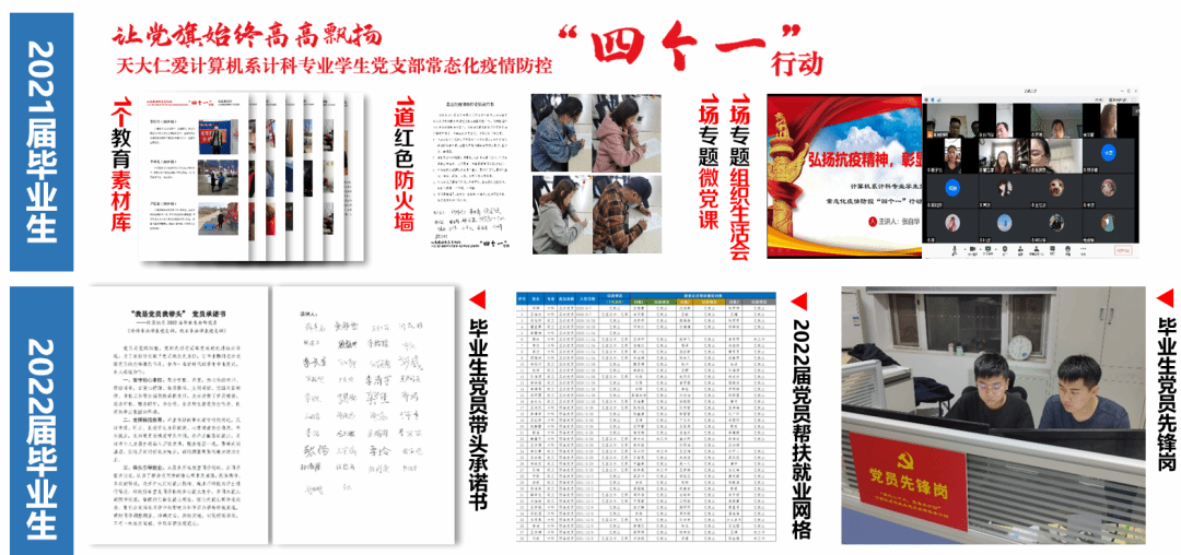 充分发挥党员先锋模范带头作用,组织党支部开展疫情防控、就业工作四个一行动毕业季期间组织全体毕业班党员签署责任书,包联帮扶同学就业,形成党员网格化推动帮扶就业。