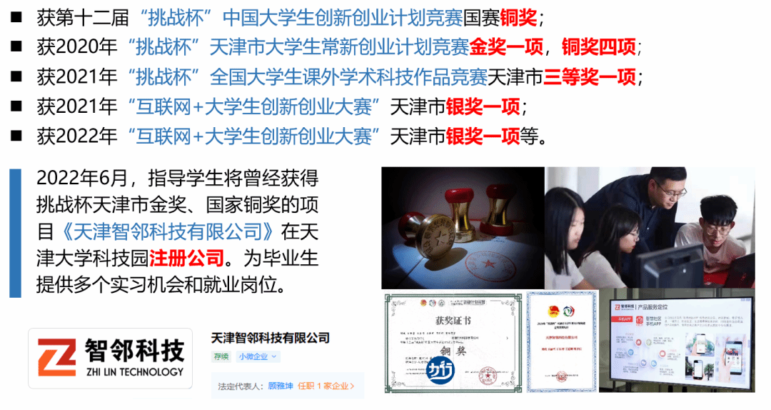 在学生创业技能培养上,积极指导孵化学生创新创业项目,近年来所指导的学生在“挑战杯”、“创青春”和“互联网+”创新创业大赛上屡获佳绩,获得国赛铜奖一项、天津市金奖一项、银奖2项,铜奖若干。