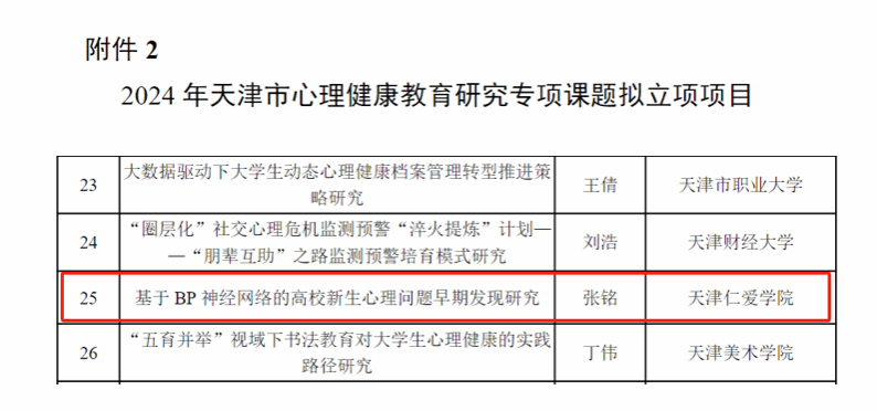 近日,市委教育工委、市教委公布了2024年天津市心理健康教育研究专项课题立项名单,我校信息与智能工程学院辅导员张铭主持申报的《基于BP神经网络的高校新生心理问题早期发现研究 》获批立项。