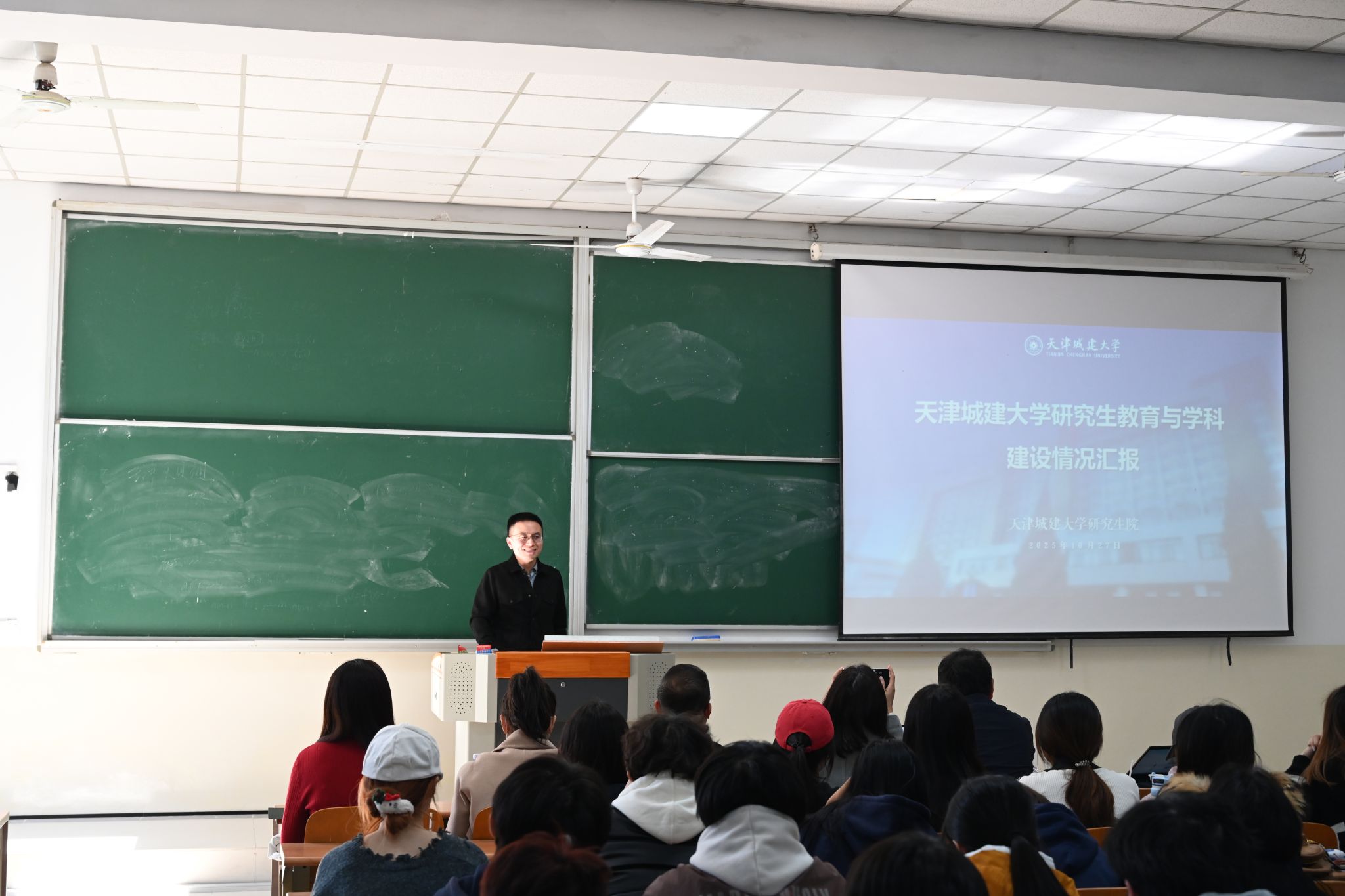 天津城建大学学科建设办公室主任党培围绕天津城建大学研究生教育的整体情况作专题介绍,从办学特色、学科优势、科研平台、导师团队及实践资源等方面系统阐述了学校的培养实力,帮助同学们全面了解其研究生教育质量与发展前景。