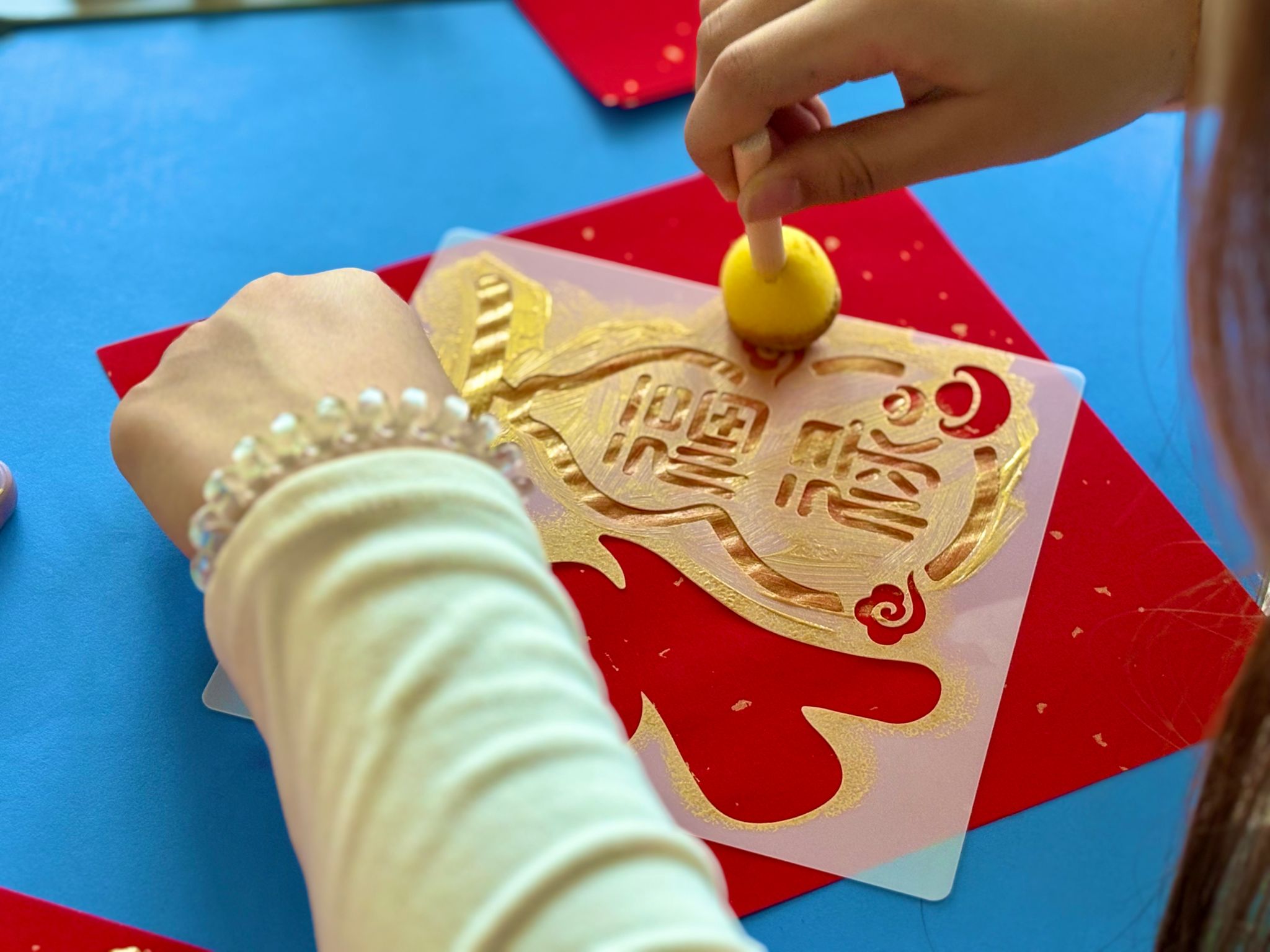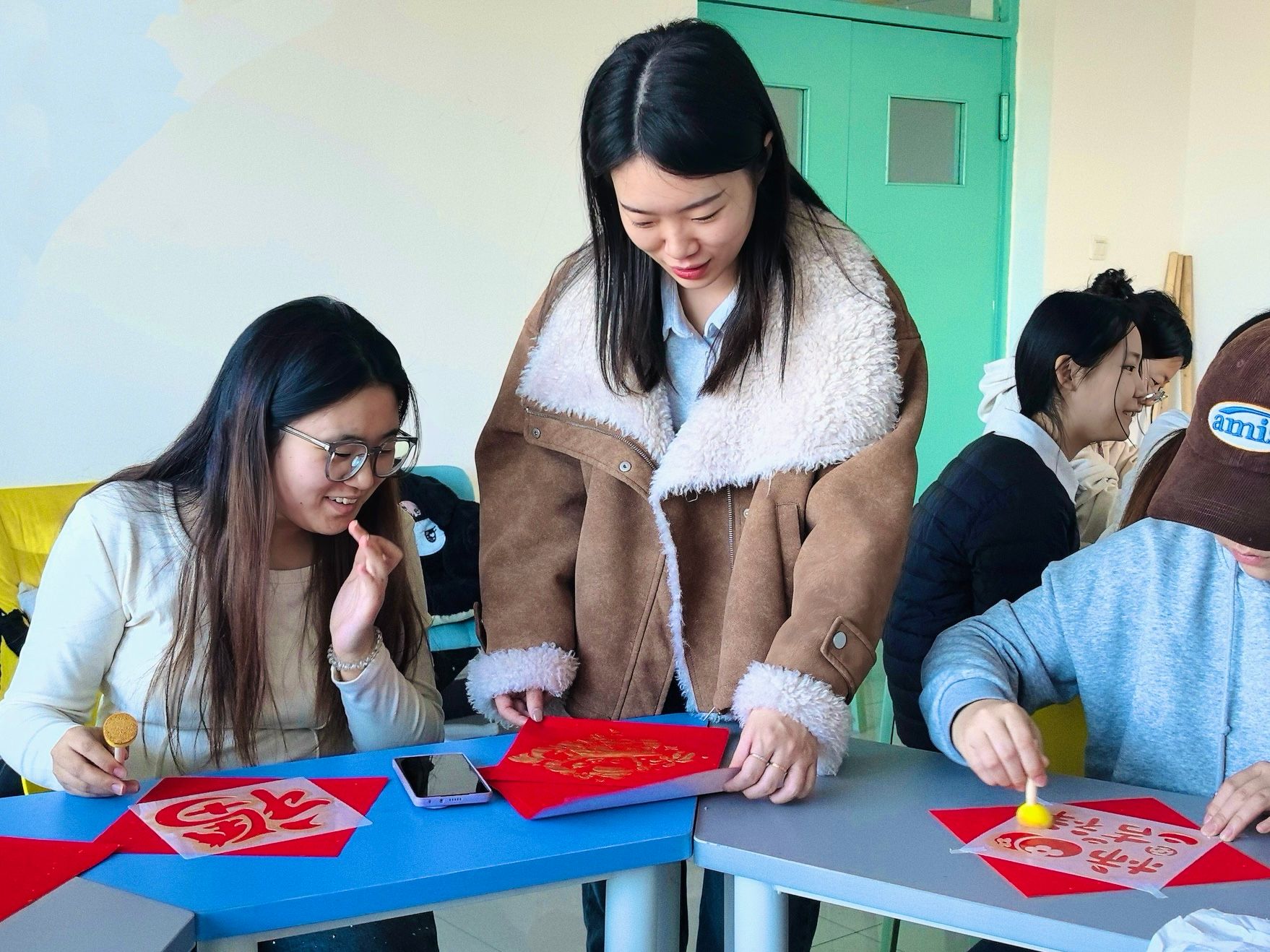 体验环节中,同学们在老师的指导下有序操作。铺宣纸、刷墨汁、覆拓包、轻敲慢碾,同学们专注投入,指尖翻飞间,一个个灵动的“福”字与一匹匹矫健的骏马图案跃然纸上。传统书法的韵味与新年的喜庆氛围完美融合,每一件作品都承载着学子们对新年的美好期许。