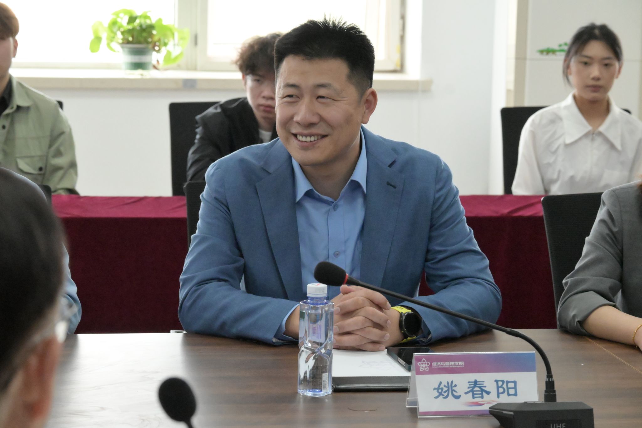 2026年4月21日,山东双轮股份有限公司董事长姚春阳、副总经理吴娇、人力资源部部长林刚、招聘主管蒋伟等一行到访经济与管理学院,院长牛占文、党总支书记高展望、副书记何亚蓉,精益智造与卓越运营产业学院副院长尧宗旗、执行院长郭盈等师生代表齐聚一堂,共同探讨校企协同育人新模式,携手谋划未来深度合作发展新路径。