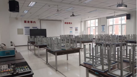 实验室面向VBSE实训,布局分为制造商、供应商两个区域,分别设置于两个相邻实验室内。其中制造商区规划72个工位,每9个工位组合为一张讨论桌,便于VBSE课程分组与互动;供应商区设置20个工位。两个区域通过多媒体投影与无线音响系统实现同步授课。