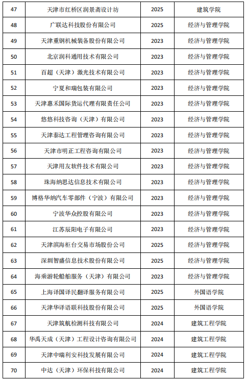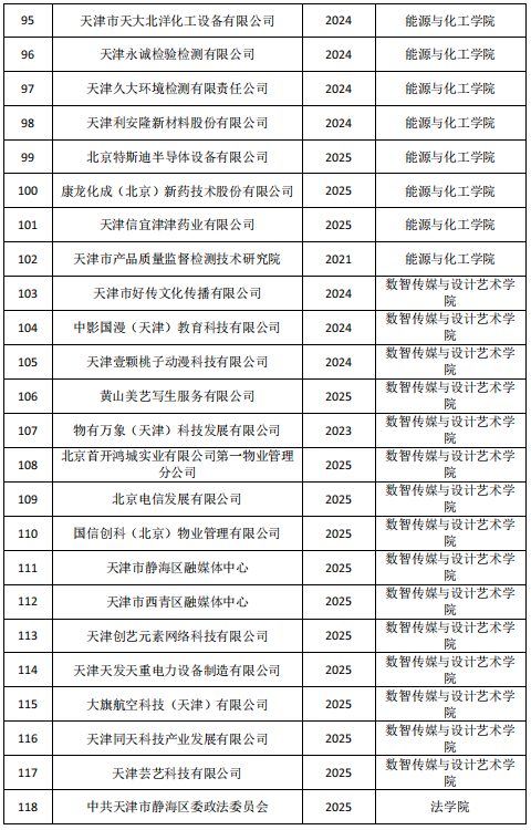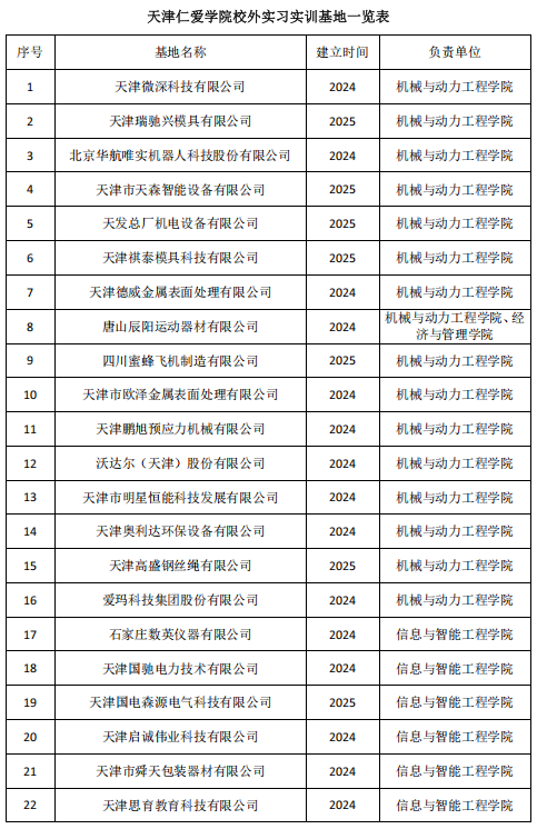 实习实训是人才培养的重要组成部分,是深化课堂教学的重要环节,是学生了解社会、接触生产实际,获取、掌握生产现场相关知识的重要途径,在培养学生实践能力、创新精神,树立事业心、责任感等方面有着重要作用。天津仁爱学院现有校外实习实训基地129个(校内不同单位在同一企业建立实习实践实训基地,不重复统计),分布在机械与动力工程学院、信息与智能工程学院、智算工程学院等12个学院(部处)。众多实习实训基地的建立,为学生实习实践,学以致用提供了平台,极大程度提升了我校实践教学水平,助力学生成长成才,服务经济社会发展。