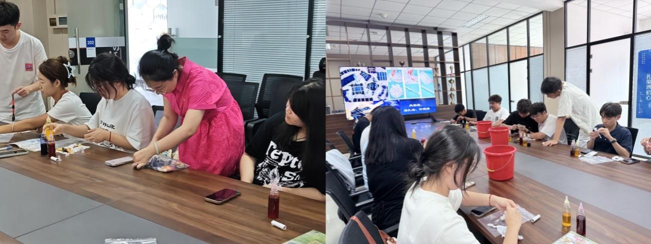 第二组同学们在焦老师的指导下深入了解了扎染这项国家级非物质文化遗产的悠久历史与独特工艺,体验了描稿、扎结、染色、漂洗和晾晒的全过程。大家在“青蓝相继”的意象中感念师者传道授业的深厚恩情。此次学院组织的扎染体验活动,以传统文化为鲜活载体,不仅丰富了同学们的校园文化生活,更在实践中增强了集体凝聚力与创造力,实现了文化传承与思想教育的双向融合。