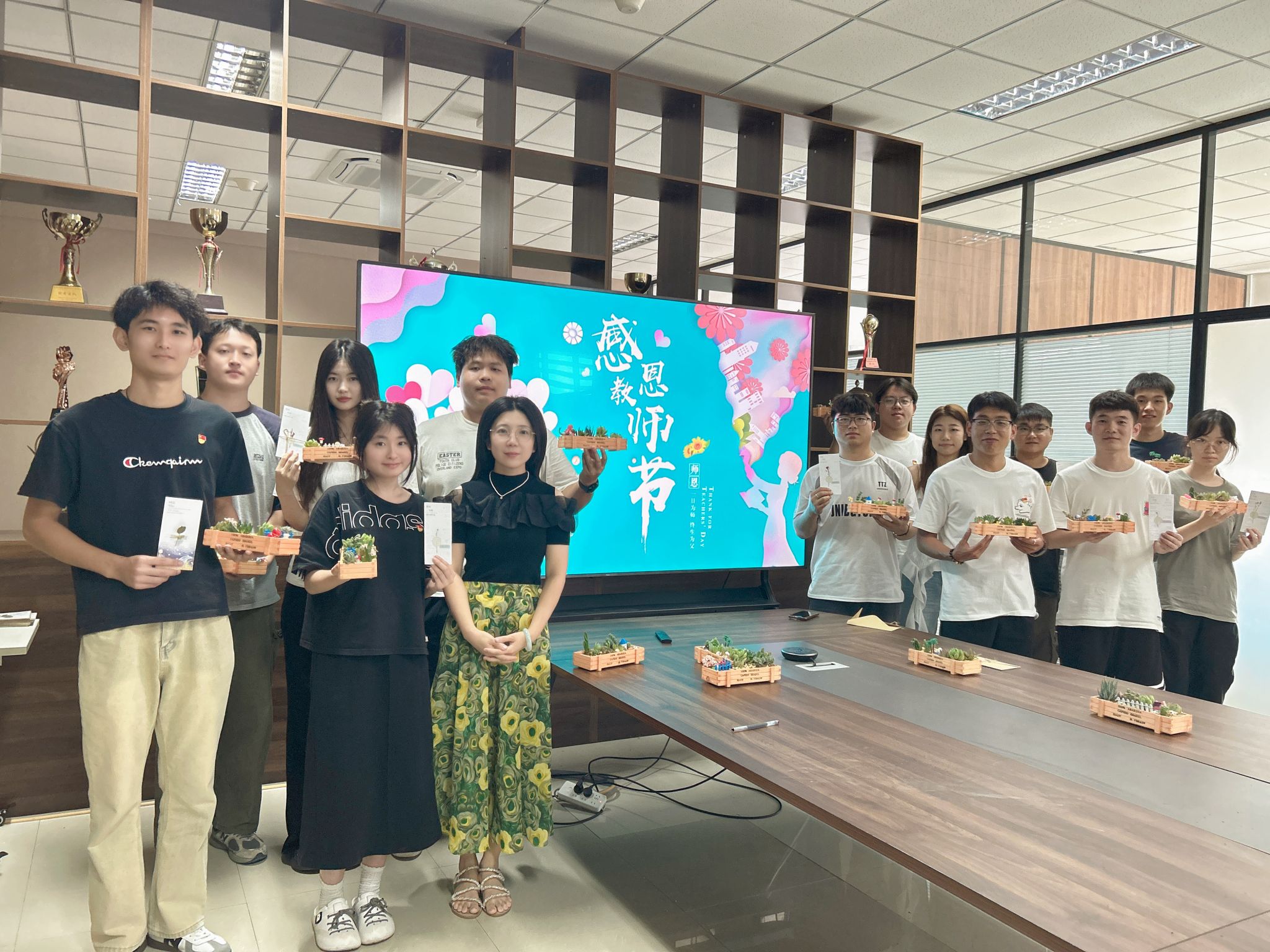 第一组同学们发挥创意与巧思,亲手制作了卡通小盆栽和写满祝福的手写贺卡。活动现场,大家充分结合专业特长与艺术创意,将普通花盆装扮成一个个生动可爱的卡通形象,每一处细节都凝聚着同学们的用心。贺卡上,一句句真挚的话语温暖动人:“感谢您不厌其烦地为我们答疑解惑”、“您的教诲如春风化雨,滋润我们的心田”……字里行间流露着学子们最淳厚的敬意与祝福。小小的绿植和贺卡,承载着同学们沉甸甸的爱与感激,而老师们收获的,是满满的感动与惊喜。