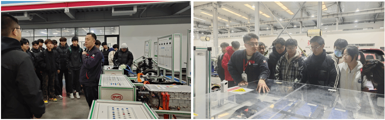 在比亚迪秦与理想ONE(增程)对比观摩区,通过实习老师的对比分析,学生直观理解了增程器、动力电池组布局以及双电机位置等方面的差异,深刻领会了“混动油电协作”与“增程油发电、电驱动”两种技术路线的核心区别。