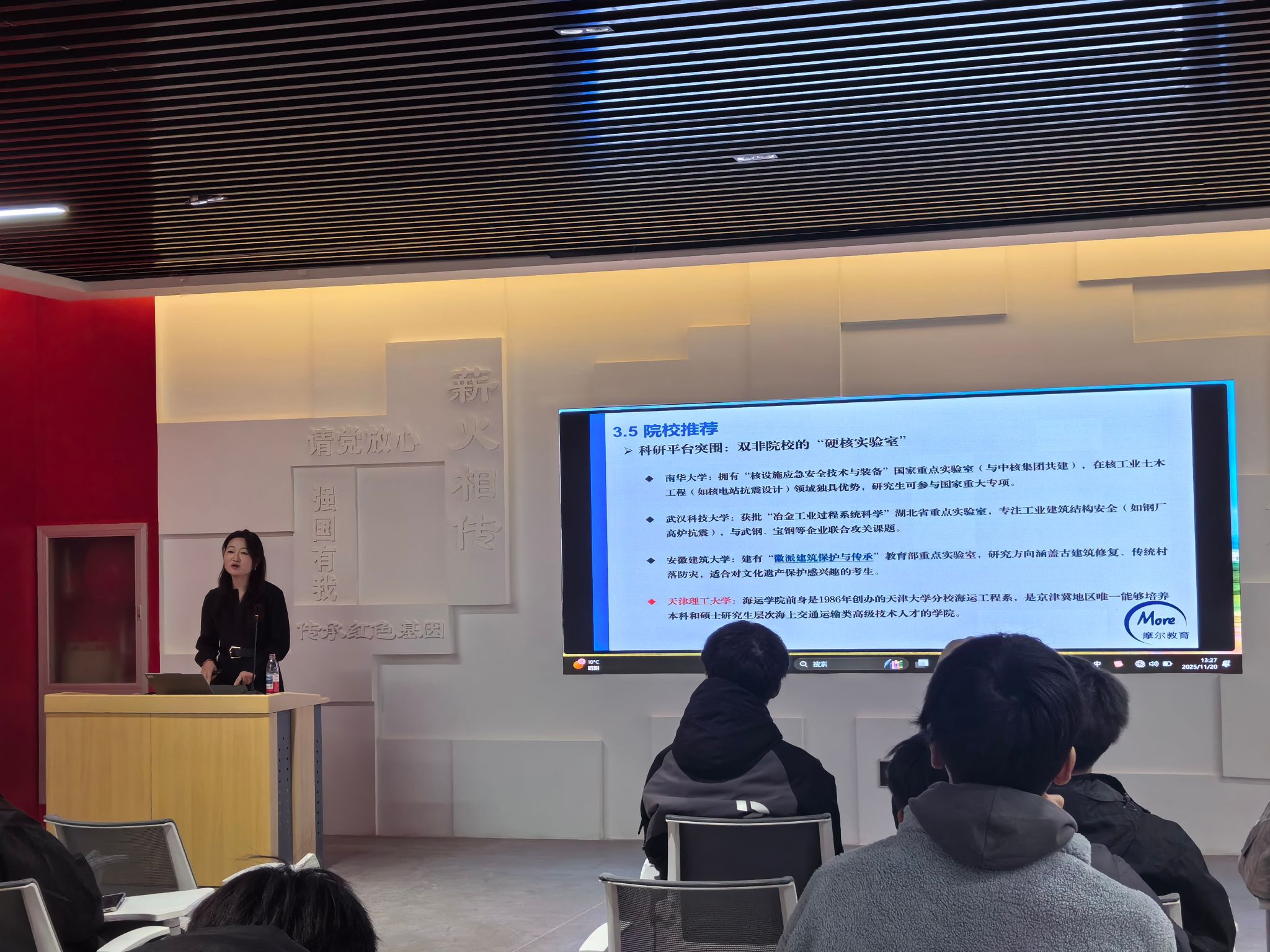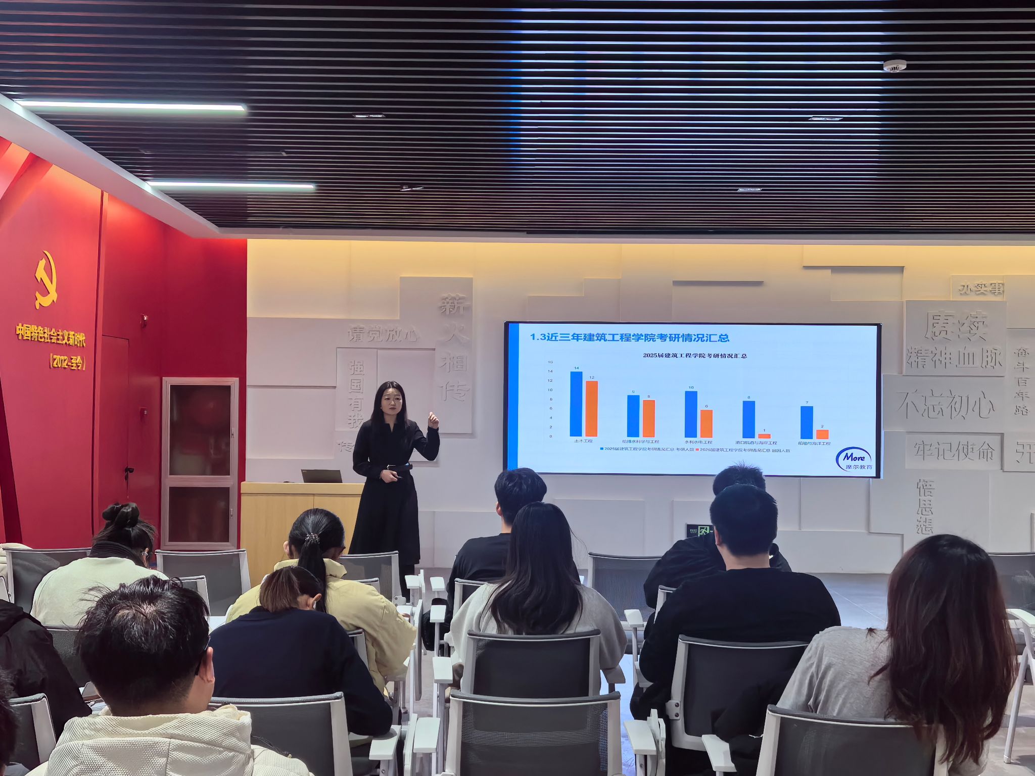 “考研不仅是学历的提升,更是专业赛道的精准选择。” 11月20日,建筑工程学院特邀摩尔教育集团考研项目部负责人孙明雪老师,开展了一场聚焦“教研沉淀”与“学生视角”的考研规划专题报告。报告以数据为基、以需求为向,从专业脉络梳理到择校逻辑拆解,为建工学子奉上了一份兼具专业性与实用性的升学指南,彰显了学院深耕人才培养、助力学生成长的责任与担当。
