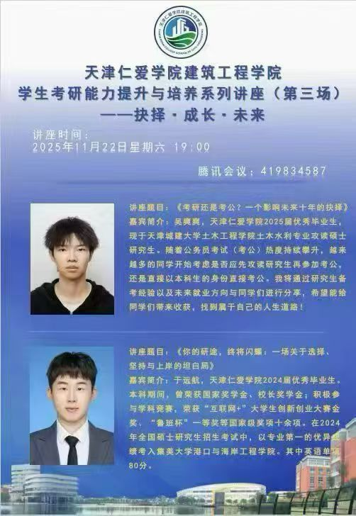 为帮助学生明确考研目标、掌握备考策略、提升应试能力,近日,建筑工程学院举办了“学生考研能力提升与培养系列讲座(第三场)”活动。本次讲座特邀学院两位已毕业的优秀校友——吴爽爽(天津城建大学)和于远航(集美大学)担任主讲,他们结合自身考研经历,为在校学子带来了一场内容丰富、实用性强、充满启发的考研经验分享会。