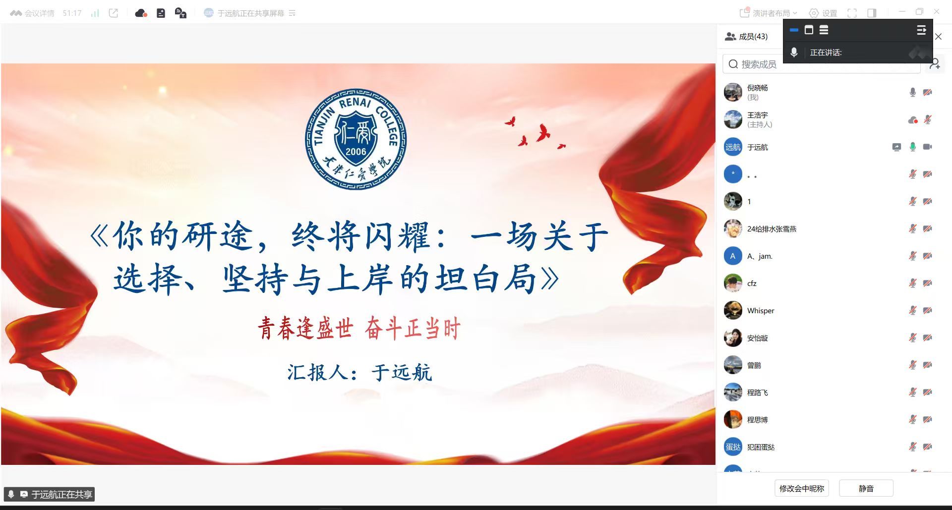 于远航同学则以“你的研途,终将闪耀”为题,围绕院校选择、学习氛围营造等核心问题展开讲解。他系统介绍了如何通过研招网、高校官网、调剂网站等渠道科学择校,提醒同学们关注专业代码、学院设置、调剂政策等细节。在英语备考方面,他提出“真题为王”的理念,强调单词记忆与真题反复训练相结合,最终英语考出了80分的高分。此外,他还分享了一系列提升学习效率、营造良好备考氛围的实用方法。