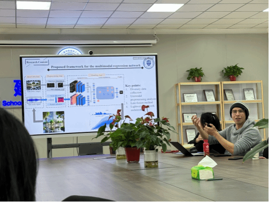 本次论坛中,留学生 Manuel Fiallos Salguero 作题为 《Multimodal-Based Method for Real Time Rainfall Monitoring Using Surveillance Cameras(基于多模态技术的监控摄像头实时降雨监测方法)》 的学术报告。报告聚焦人工智能与环境科学交叉融合,系统介绍了融合计算机视觉与声学信号处理的深度学习方法在实时降雨监测与城市水文预报中的应用。Manuel结合国际前沿研究与工程实践,阐述了利用智能监控摄像头等泛在传感器,在复杂多变环境条件下实现精准降雨测量的技术路径,展示了多模态感知技术在智慧城市与水环境管理领域的应用潜力。