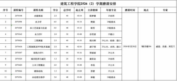 本次磨课活动聚焦学院土木、水利、给排水、港口4个专业的核心教学需求,参与对象包括银龄教学专家团队、11门课程的主讲教师及相关专业专任教师。磨课覆盖的课程涵盖《水能规划》《水力学》《水工艺设备与仪表》《水力学2》《工程测量》《工程制图及BIM技术基础》《结构力学A》《城市防洪与减灾》《土木工程概论》《砌体结构》《水处理生物学》,课程学分跨度1.5-4.0分,总学时24-64学时,授课年级覆盖23、24、25级,课程类型包含专业基础课、专业核心课,全面贴合各专业人才培养方案的教学要求。