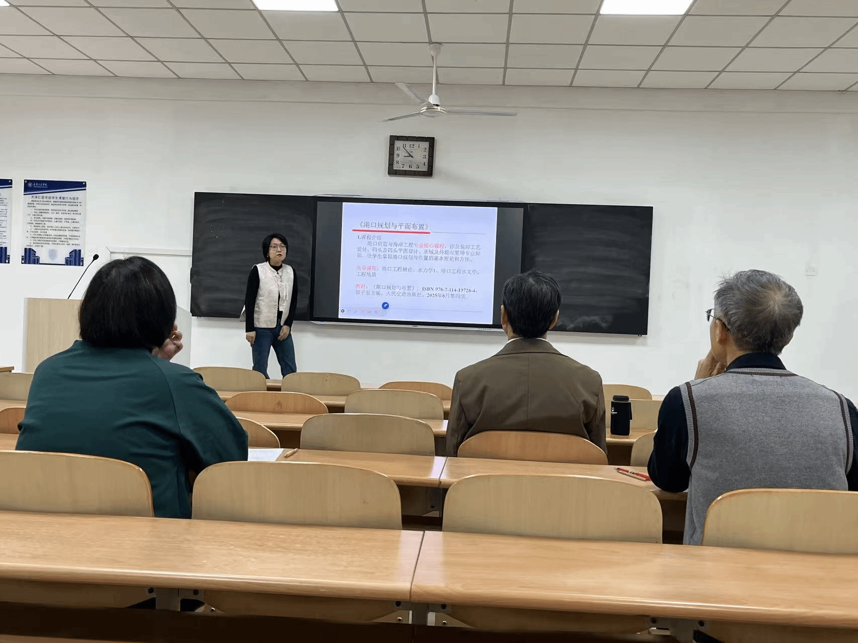 刘佳老师带来《港口规划与平面布置》和《港口工程概论》两门课程。《港口规划与平面布置》以航道设计为重点,讲解航道轴线选择、有效宽度计算等内容,结合宁波大榭集装箱码头工程实例展开教学,板书绘图清晰、知识点过渡自然;《港口工程概论》从港口与航道基本概念出发,介绍港口分类、我国五大港口群布局及港工技术发展历程,巧妙融入课程思政元素。专家肯定其教学逻辑顺畅、举例贴切,板书与PPT相得益彰,同时建议放缓授课语速、突出关键词强调,为《港口工程概论》课程图片增加图名,对核心概念进一步总结以加深学生记忆。