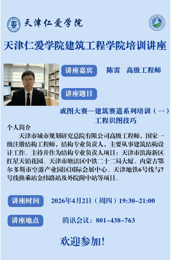为备战全国大学生成图大赛,提升我院学子建筑识图与建模能力,助力同学们在赛事中斩获佳绩,2026年4月2日,建筑工程学院成功举办成图大赛建筑赛道工程识图专项培训。本次培训特邀天津市城市规划研究总院高级工程师、国家一级注册结构工程师陈雷主讲,学院各年级参赛同学积极参与。