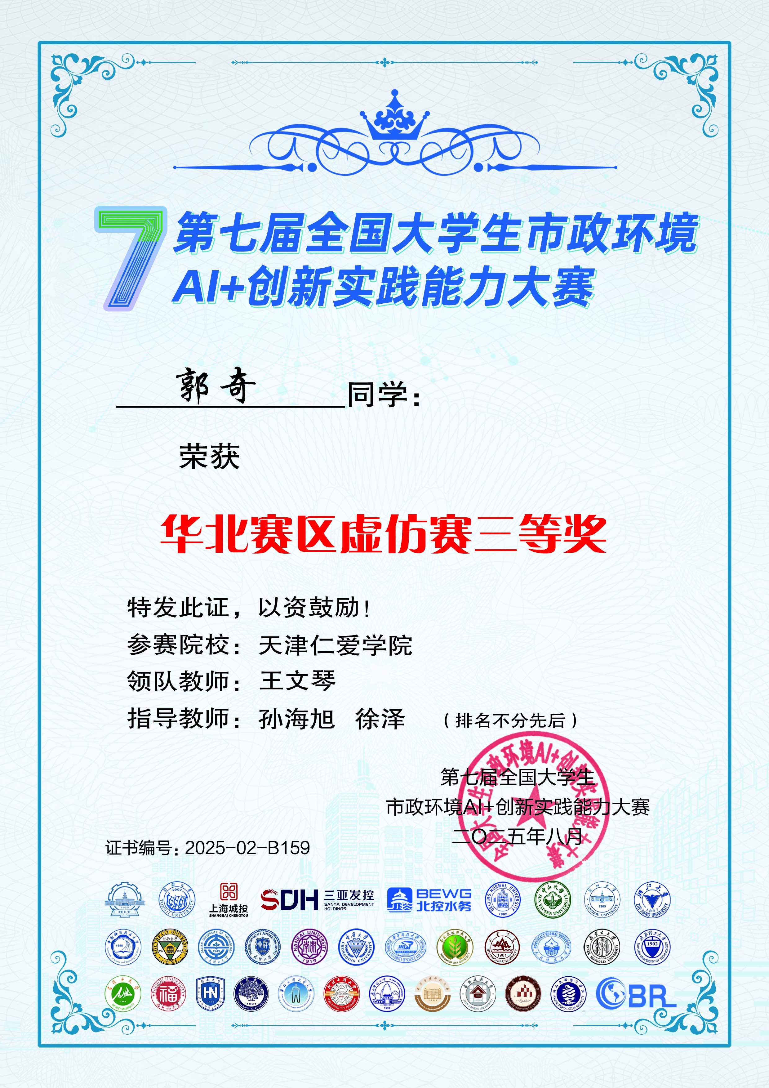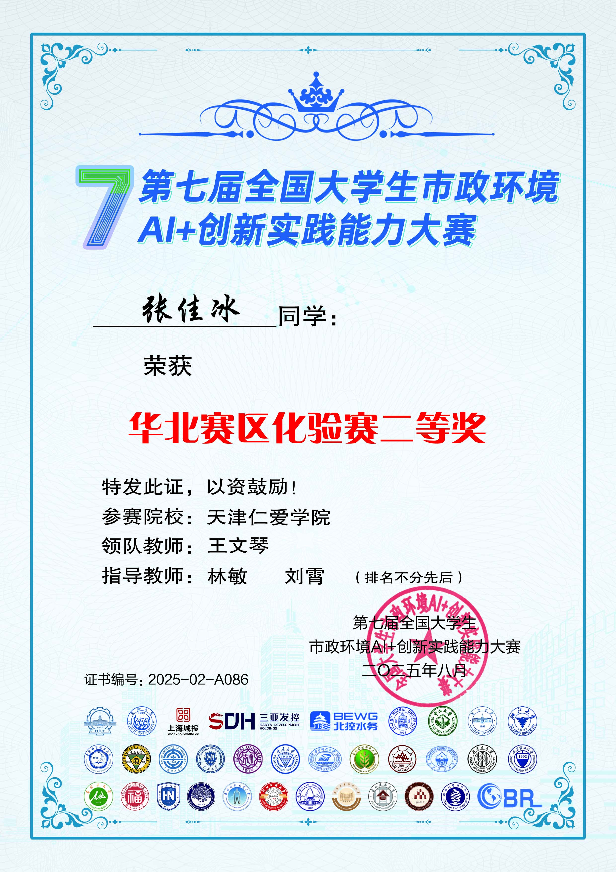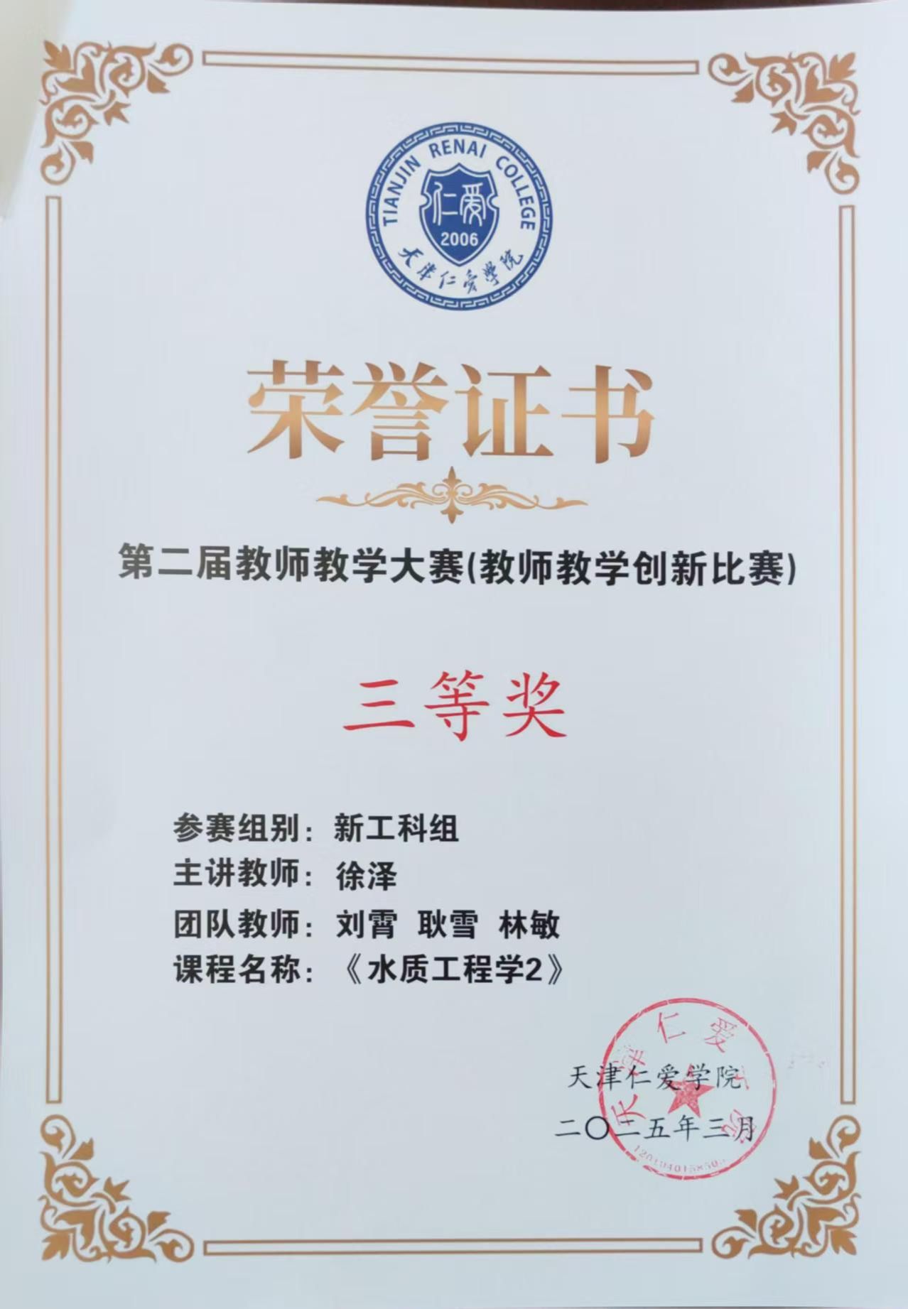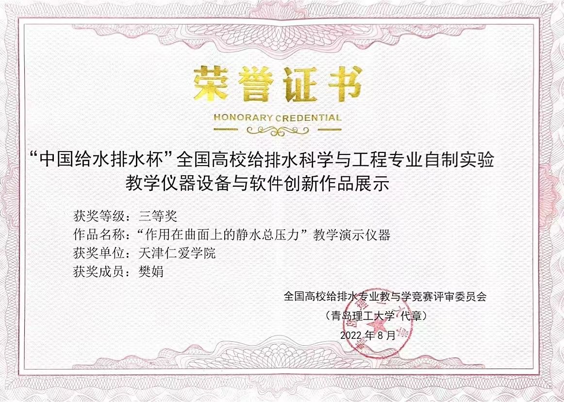 王文琴:实验师,天津大学环境工程专业硕士毕业,研究方向为水处理实验技术。主讲《水处理实验》、《水分析化学实验》等核心课程,完成校级教改项目2项。参与纵向项目2项,主持及参与横向项目10余项,共计发表文章11篇,其中SCI收录一篇、CSCD收录一篇,授权实用新型专利3项,发明专利公开1项,指导学生双创实践以及学科竞赛获奖10余项。