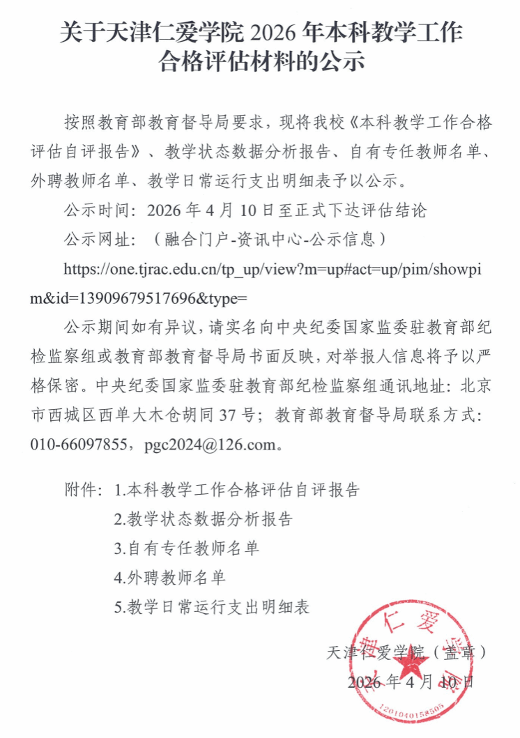 关于天津仁爱学院2026年本科教学工作合格评估材料的公示