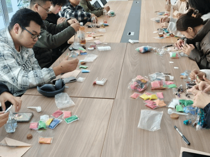 活动在静谧舒缓的氛围中拉开序幕,第一项环节为“情绪漂流瓶”手工制作。同学们在张雅玮老师的引导下,领取了彩砂、彩珠、干花等各式材料,开始专注地装饰属于自己的漂流瓶。一捧彩沙代表一份心境,一枚彩珠寄托一个愿望,一朵干花封存一刻时光。方寸之间的创意制作,不仅是艺术体验,更是一次有效的情绪表达与压力疏解。同学们在手工中学会分享入学初期的复杂感受,将无形的情绪转化为有形的作品,完成了首次大学情感世界的自我探索与释放。