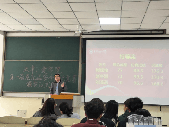 王玥院长在讲话中对获奖同学表示热烈祝贺,充分肯定了大家在竞赛中展现出的专业素养与拼搏精神,并鼓励同学们将危化品安全知识内化于心、外化于行,在今后的学习和科研中时刻绷紧安全之弦。蔡志利书记则从责任与使命的角度出发,勉励同学们以赛为契,不断提升安全意识与专业能力,为化工行业的安全发展贡献青春力量。