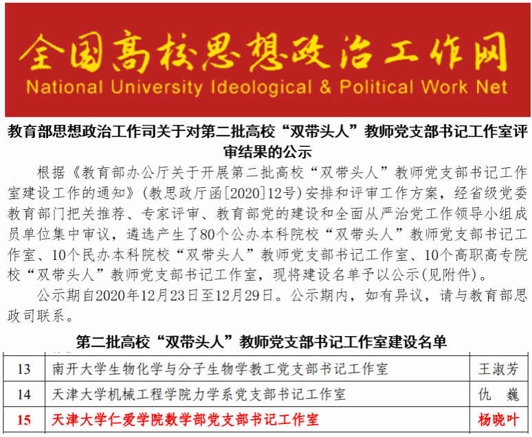 2020 年,数学部党支部入选第二批高校 “双带头人” 教师党支部书记工作室。党支部围绕 “抓好党建主责主业、以高质量党建引领中心工作” 这一工作核心,以 “打造亮点强党建,树立品牌抓党建” 为目标,促进 “党建与教学、党建与科研” 的双融合;通过搭建 “民办高校教师党建交流”“教师党支部书记培养”“青年教师多元能力开发” 三个平台,着力打造 “课程思政案例库”“党教研融合”“活动 (竞赛) 党支部”“青年骨干教师团队” 四类品牌为工作重点,通过坚持守正创新、强化责任担当,全力推动部门工作提质增效。