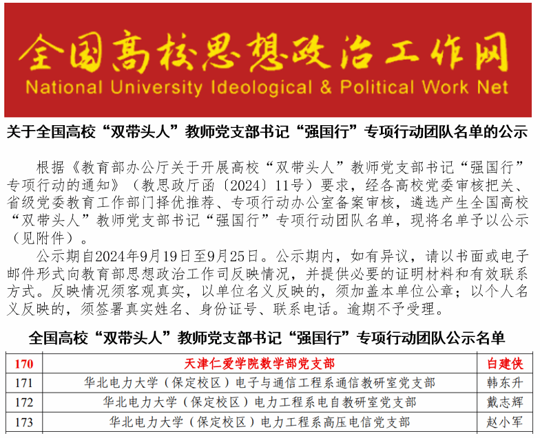 2024年,数学部党支部入选全国高校“双带头人”教师党支部书记强国行专项行动团队。党支部坚持以习近平新时代中国特色社会主义思想为指导,以全国高校“双带头人”教师党支部书记工作室为抓手,充分发挥党支部战斗堡垒作用和党员先锋模范作用,坚持党建引领中心工作,围绕“党建联建、教育服务、科技赋能、实践育人”积极发力,深入落实立德树人根本任务,全力推进“全员育人、全程育人、全方位育人”体系建设。党支部以课程建设和教学改革等为着力点,积极开展校内外联学共建,实现经验互鉴、发展互促、资源共享,形成有特色的教育服务品牌。