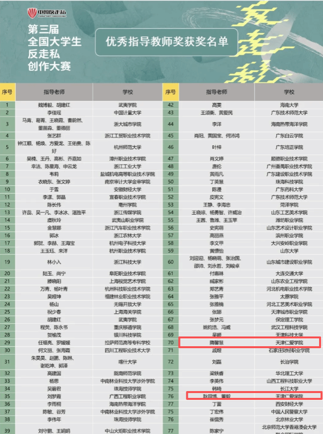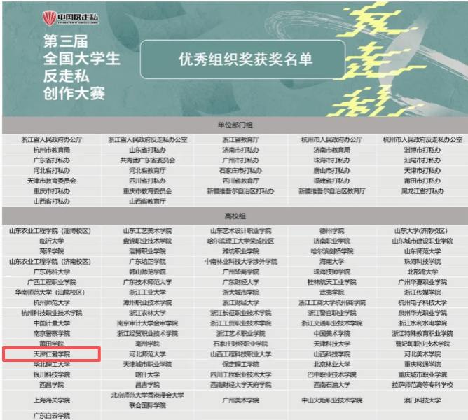 近日,2024年第三届全国反走私创作大赛获奖名单正式揭晓。本次大赛得到了我院广大师生的大力支持和积极响应,共30名参赛选手踊跃参与,经过激烈角逐,我院的孟拓、周小雨、王润嘉、王黎元、杨晨孝、刘洋、卓蔚然、俞晓蕊同学荣获优秀奖。天津仁爱学院获优秀组织奖,隋馨慧、耿坤博、董毅老师获优秀指导教师奖。
