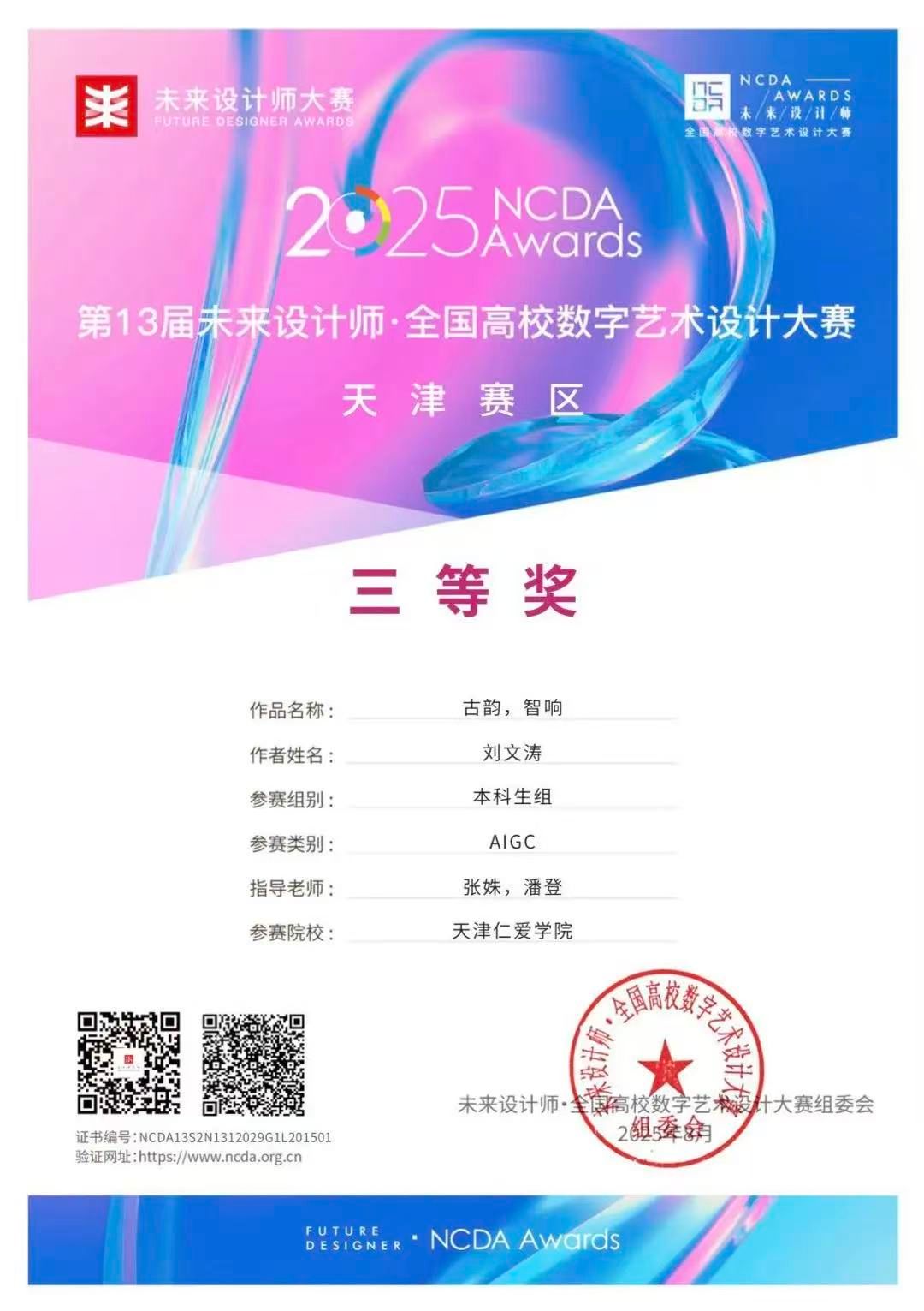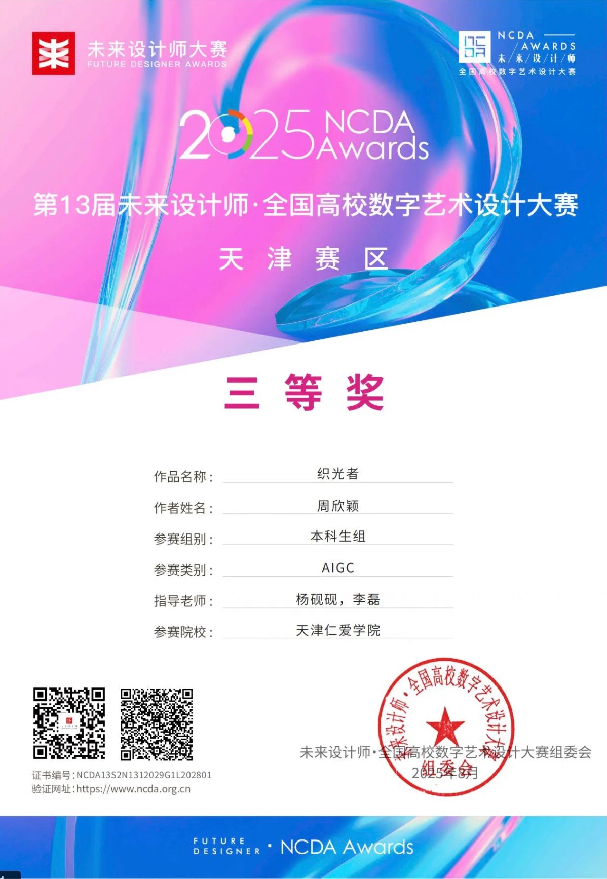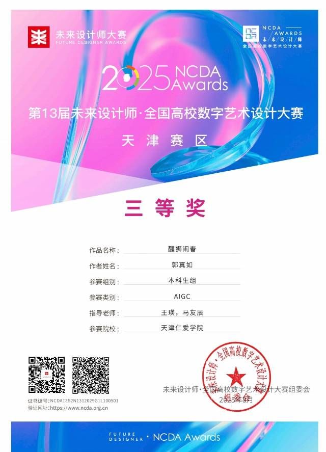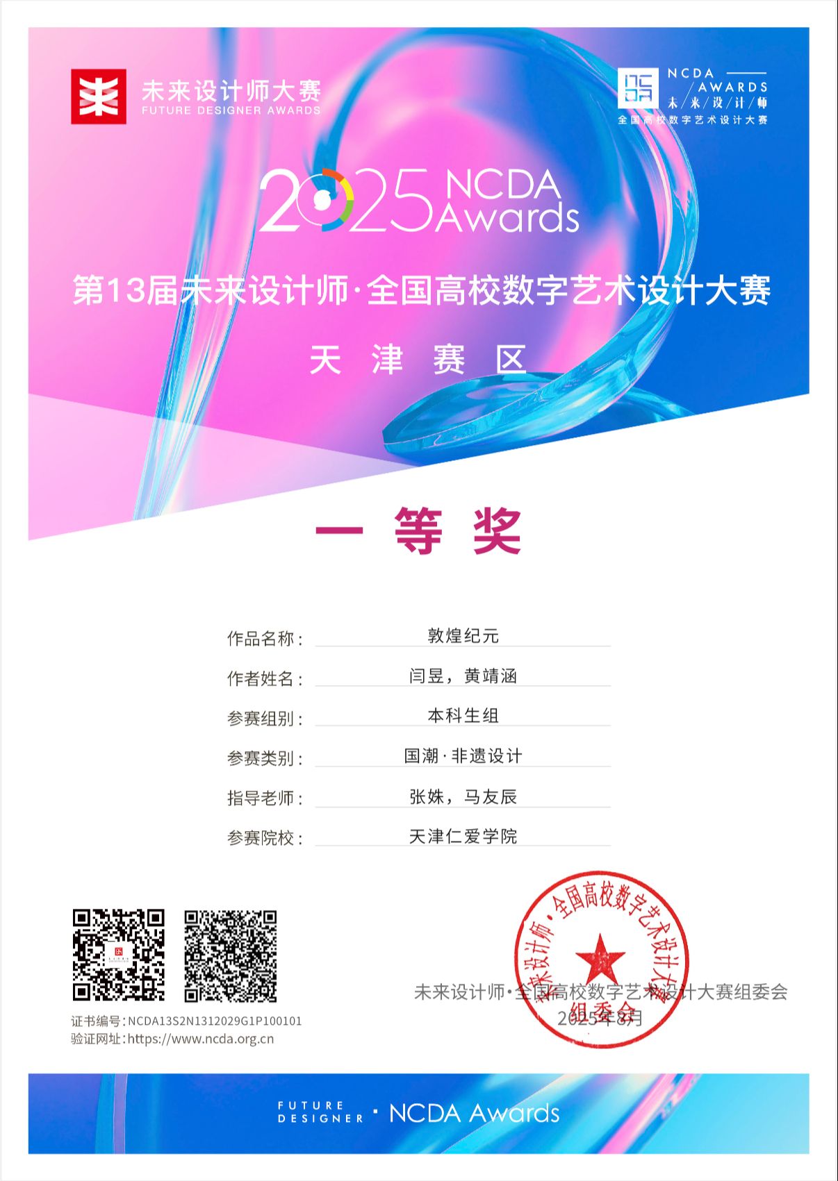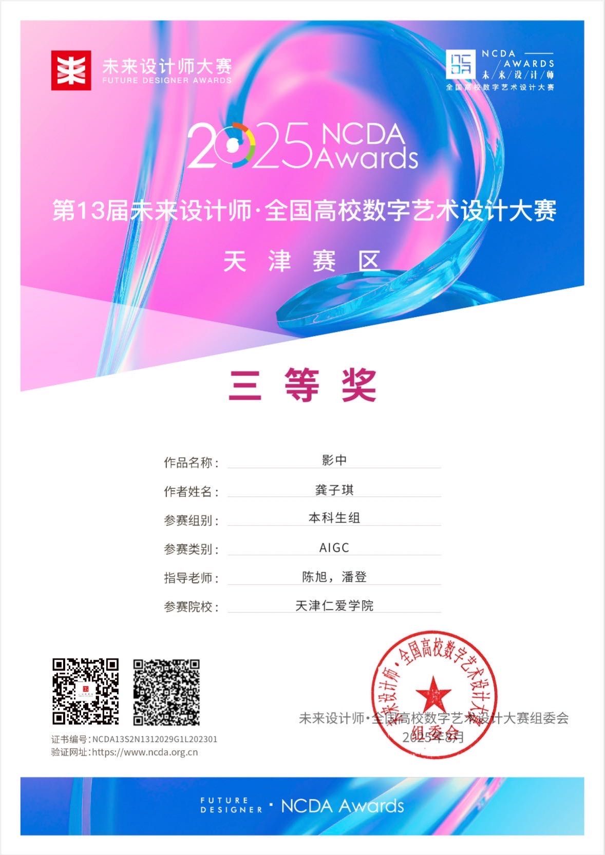 近日,2025年第13届中未来设计师·全国高校数字艺术设计大赛(NCDA)-天津赛区大赛获奖名单正式揭晓。本次大赛得到了我院广大师生的大力支持和积极响应,近200名参赛选手踊跃参与,经过激烈角逐,我院师生获一等奖11项、二等奖15项、三等奖29项。