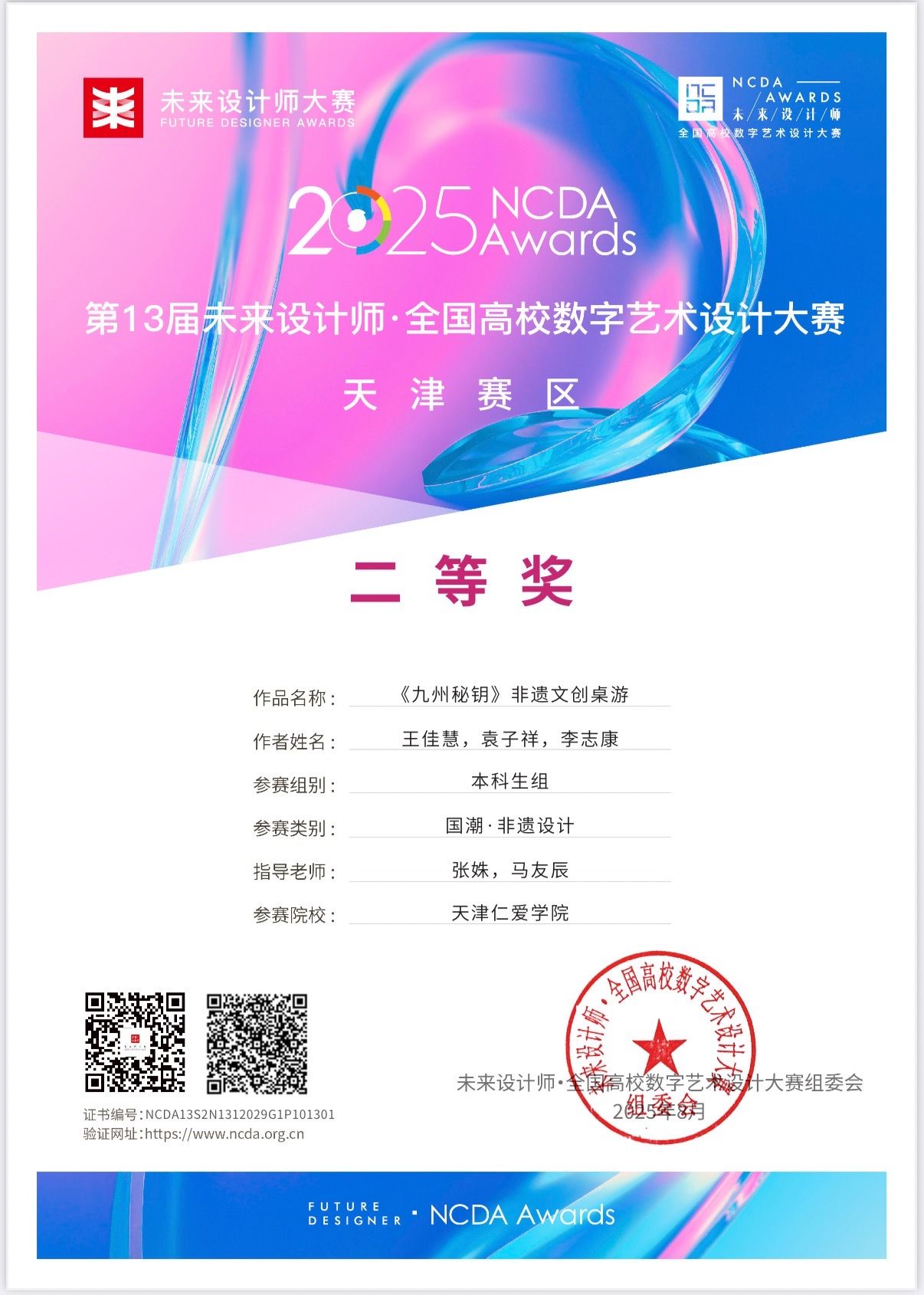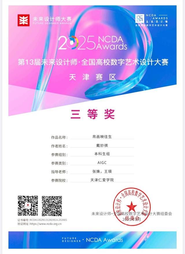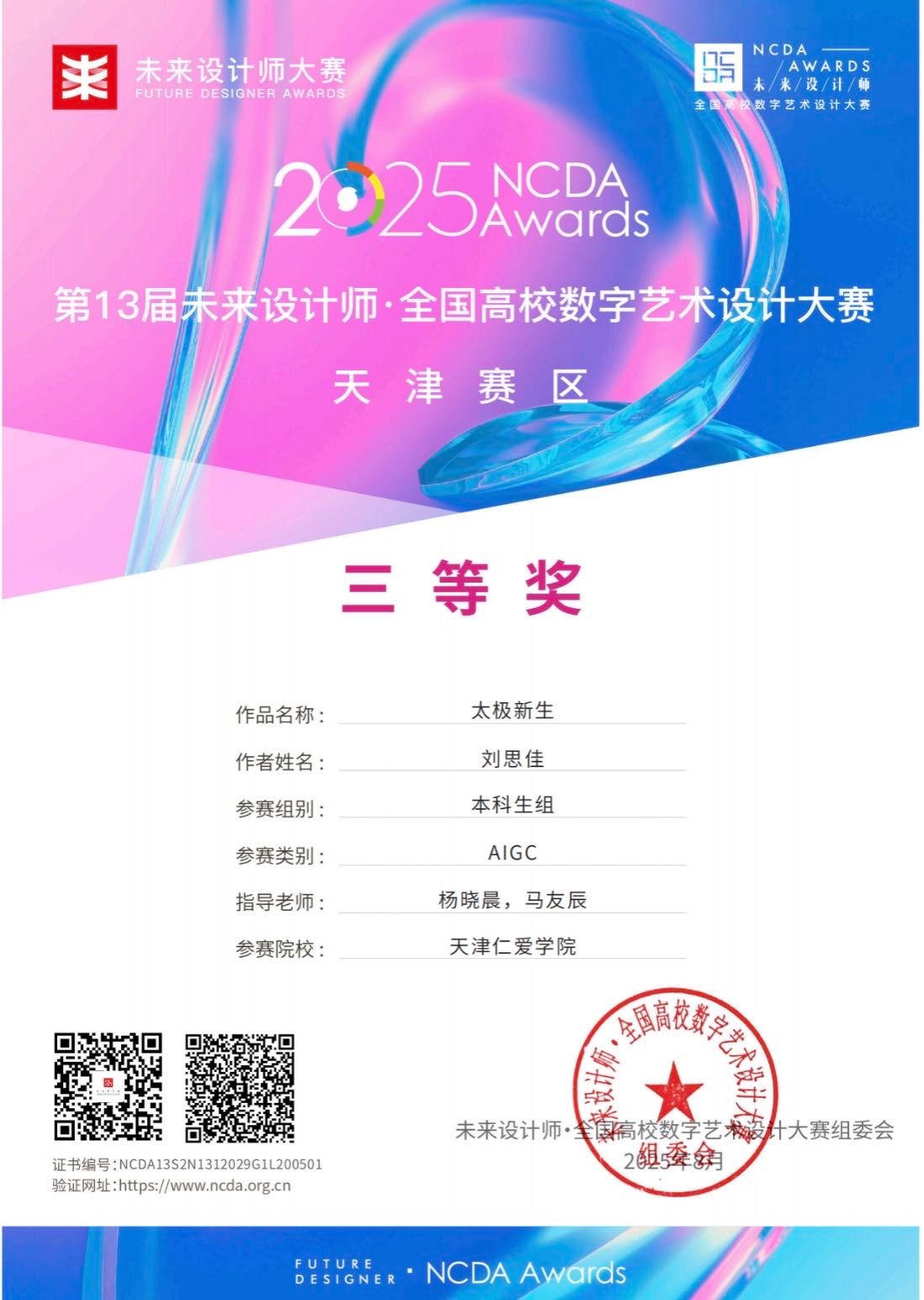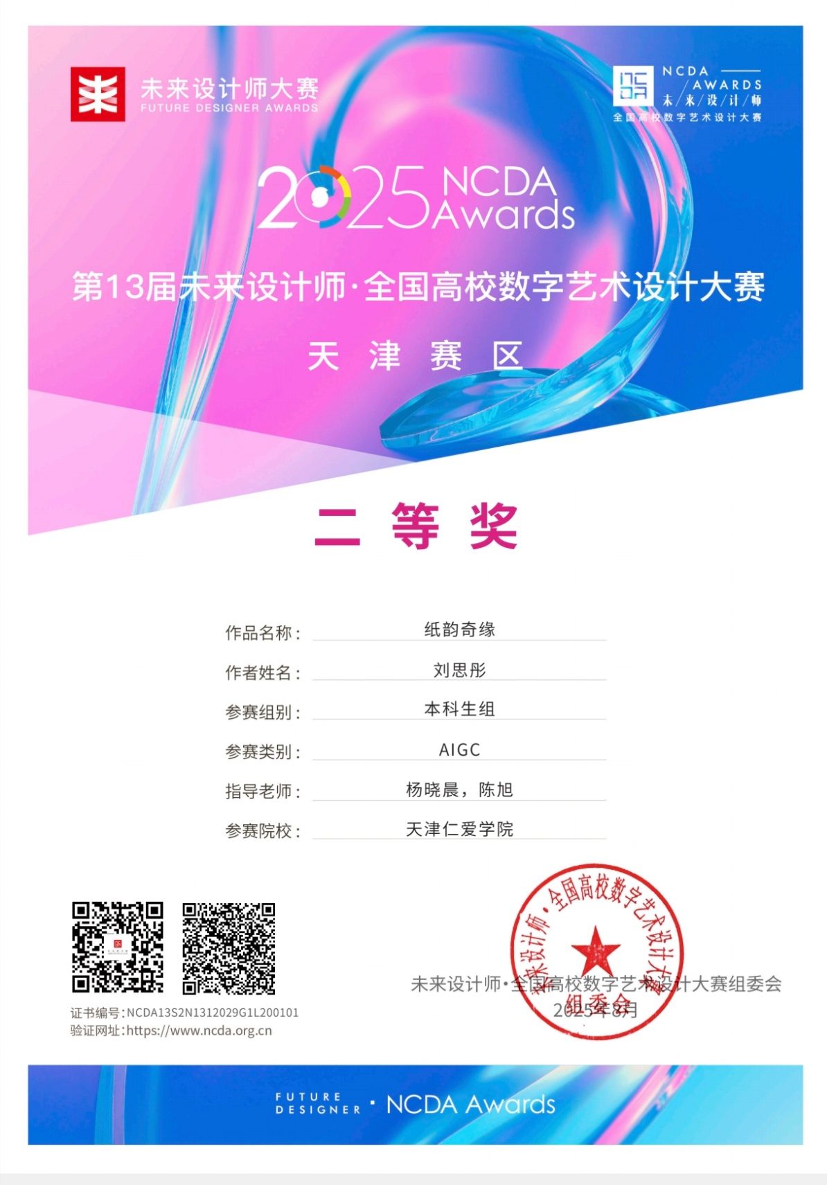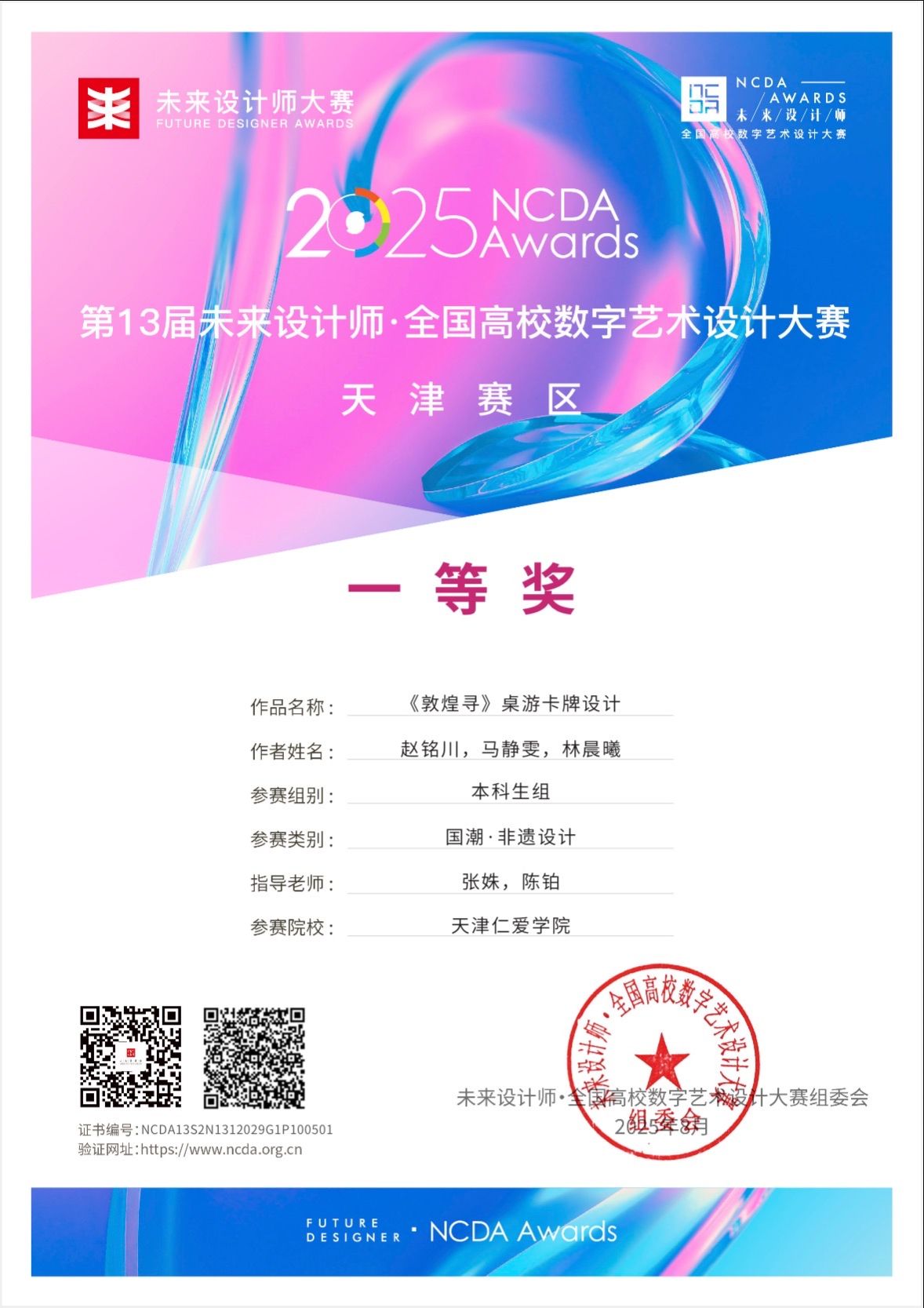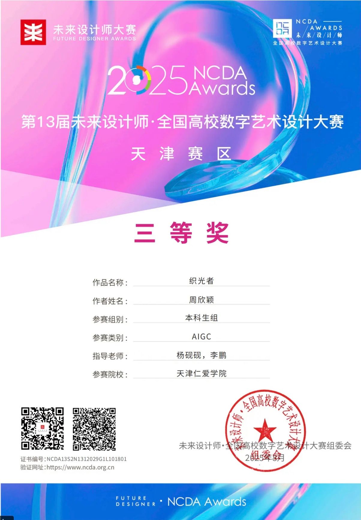 近日,2025年第13届中未来设计师·全国高校数字艺术设计大赛(NCDA)-天津赛区大赛获奖名单正式揭晓。本次大赛得到了我院广大师生的大力支持和积极响应,近200名参赛选手踊跃参与,经过激烈角逐,我院师生获一等奖11项、二等奖15项、三等奖29项。