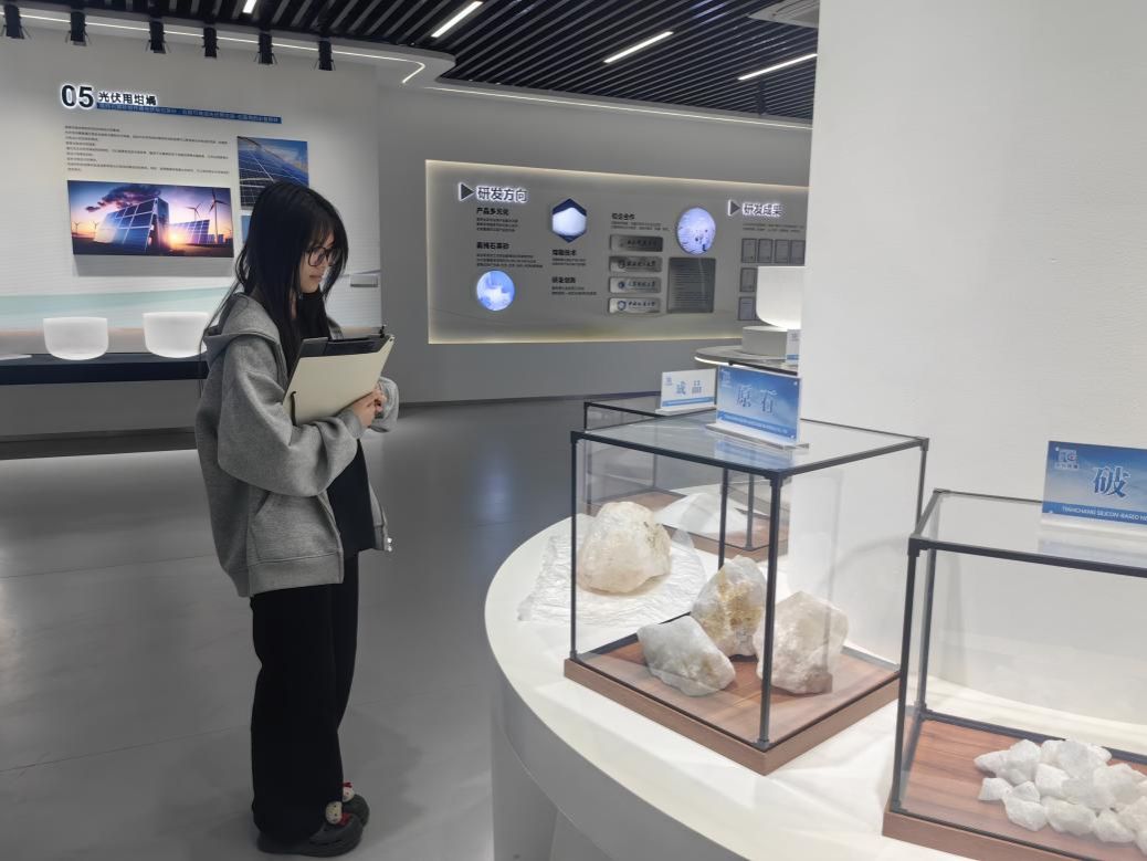 在沈主任的陪同下,师生还参观了企业产品展馆,系统了解了从硅石原料到高纯度石英制品等一系列硅基新材料的研发历程与应用领域。通过实物展示与系统数据的对照,团队对管理系统所服务的实体产业内容及其行业价值,有了更为全面和深入的认识。