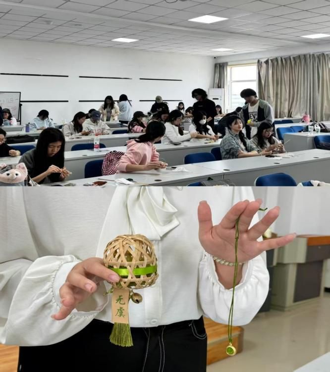 在主持人的引导和工作人员的耐心协助下,同学们认真投入编织过程,顺利完成属于自己的竹编香囊铃铛作品。现场气氛轻松温馨,大家在动手实践中收获了成就感与乐趣。活动最后,全体同学手持亲手制作的竹编香囊铃铛合影留念,为本次“珺承非遗—编铃纳福”主题活动画上圆满句号。