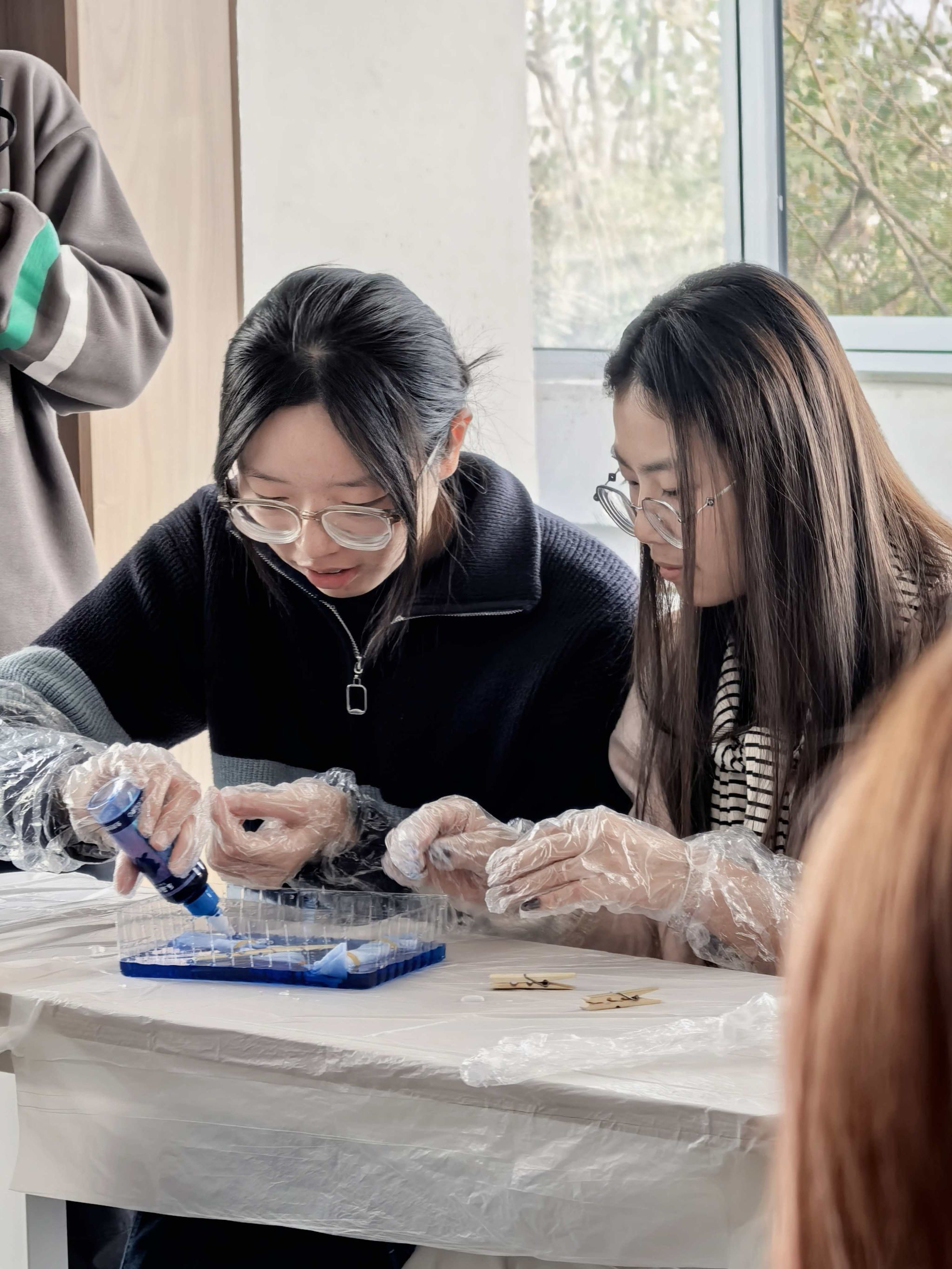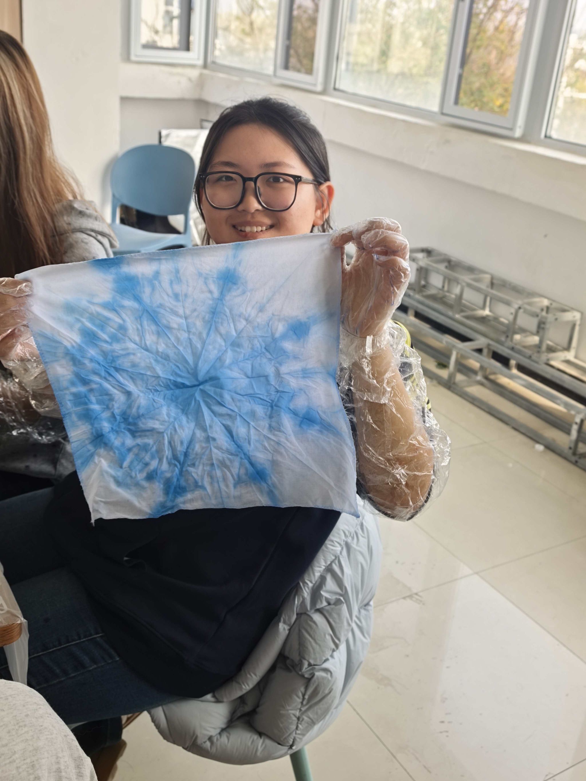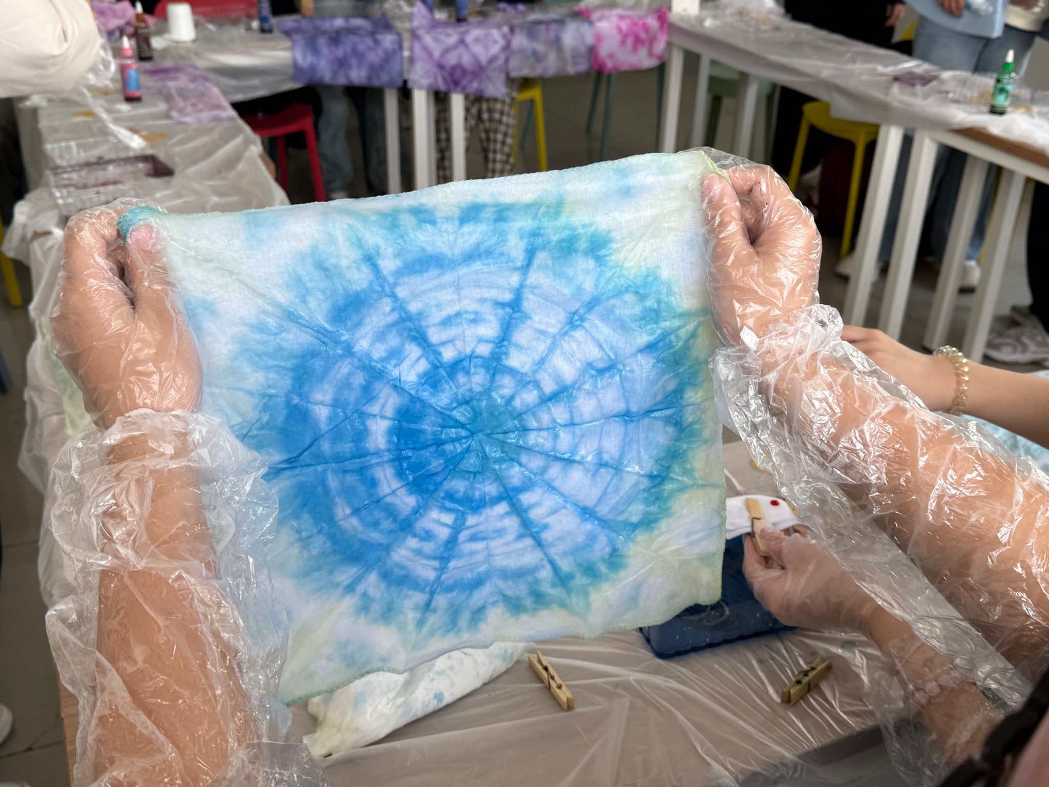 主持人阐释了扎染艺术在情绪疏导与压力释放方面的积极作用,引导学生理解手作过程与心灵疗愈的深层连接。在核心创作环节,志愿者们全程陪伴指导,同学们沉浸于折叠、捆扎、浸染的全过程——白布在指尖翻转变幻,棉绳缠绕出独特纹理,染料渗透间绽放缤纷色彩。大家专注投入,学业压力悄然缓解;在自由创作中,内心情绪得以舒展,每一件作品都成为情感表达的独特载体。