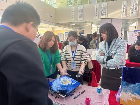 数智传媒与设计艺术学院教工党支部将专业实践与党建服务深度融合,支部党员教师张姝、杨砚砚带领学生实践团,精心策划并开展了一场别开生面的“流体艺术创作体验”主题党日活动,把美育课堂搬到群众身边。