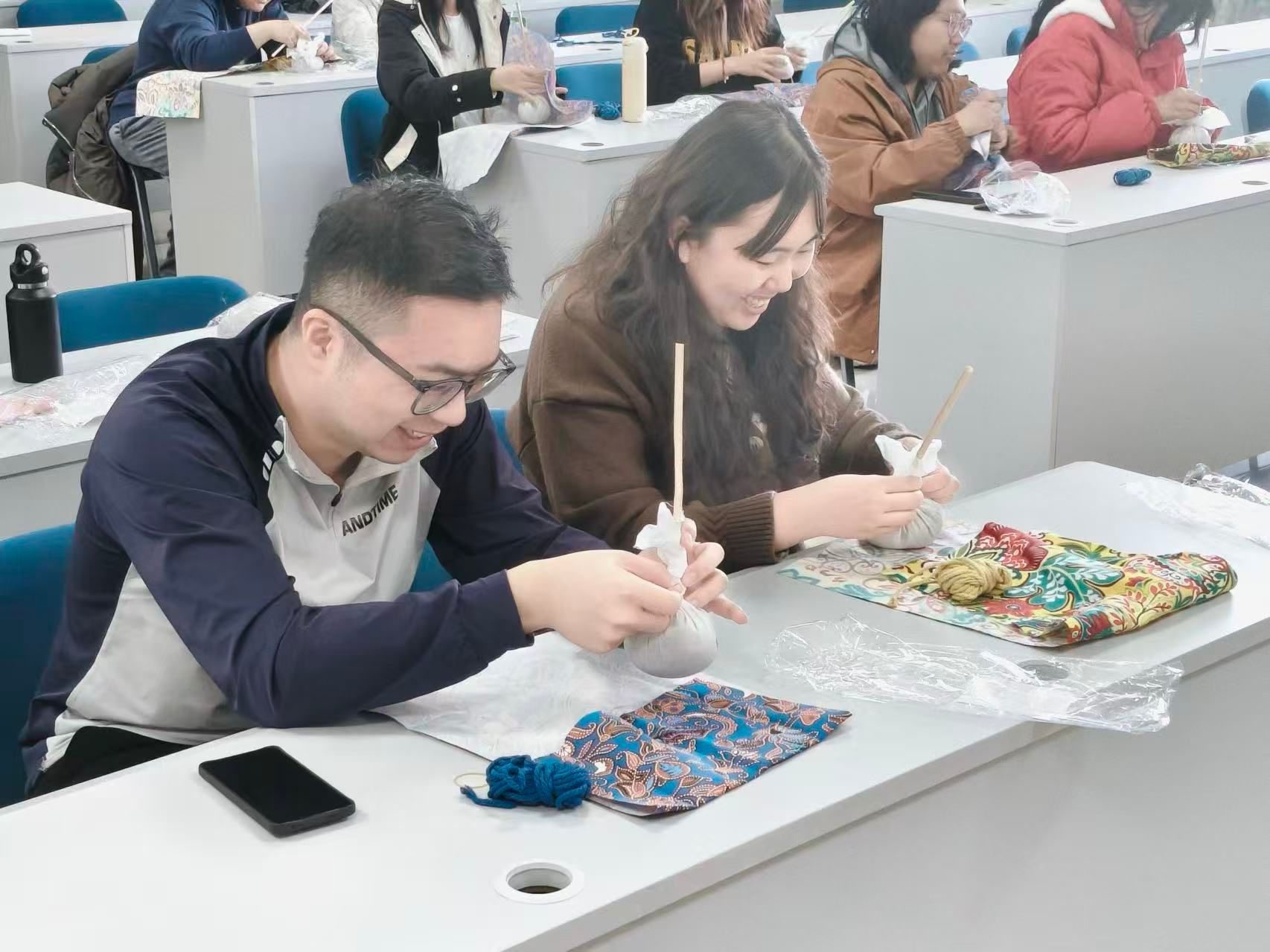 随后,2025级产品设计专业庞津同学讲解了艾草锤的制作步骤与所需工具,从布料包裹、缝制固定到装饰完成,逐步说明制作工艺。参与学生在指导下动手制作,体验艾草锤的制作过程。