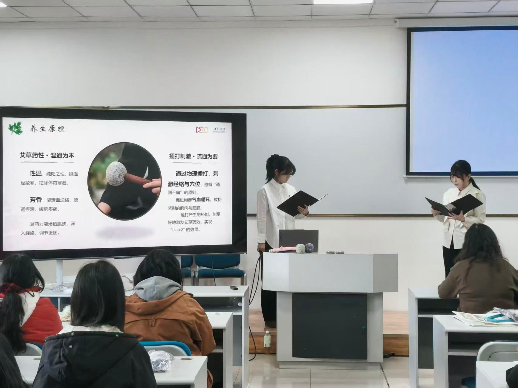 活动中,2025级产品设计专业张平爱同学介绍了艾草锤的历史背景与文化内涵,阐述了艾草在传统养生中的用途及其作为非遗项目的价值。
